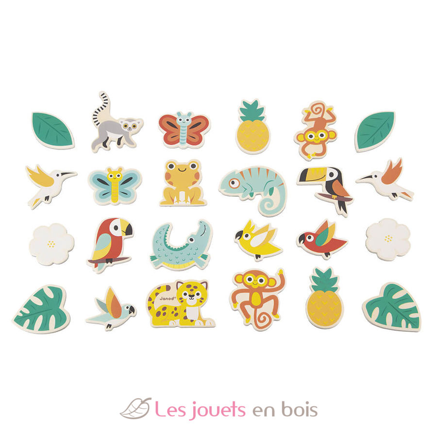 Set mit 24 illustrierten Holzmagneten zum Thema Tropenwald. Ein Papagei, ein Jaguar, ein Lemur... es gibt so viele Tiere zu entdecken!