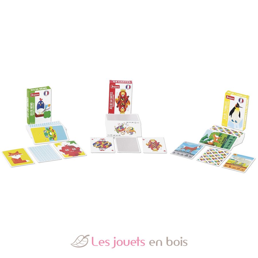 Drei unverzichtbare Kartenspiele für Kinder: 54-Kartenspiel, 7-Familien-Spiel und Memory.