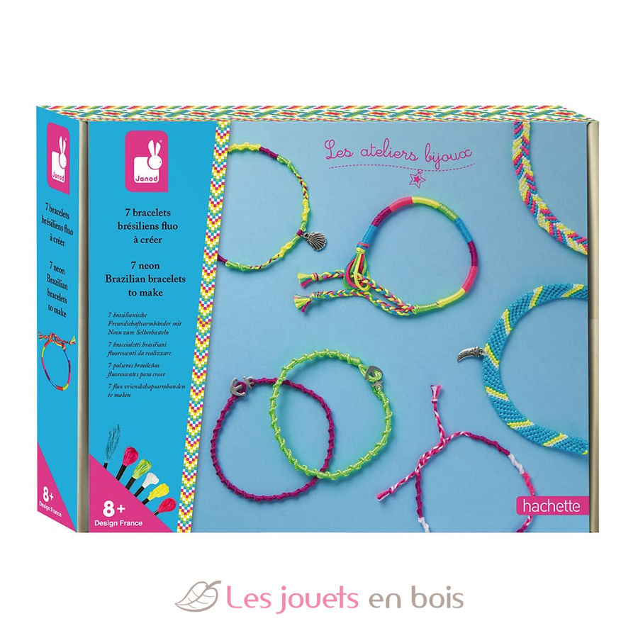 Entdecken Sie das Kreativ-Set "7 brasilianische Armbänder in Neonfarben zum Basteln" von Janod, eine kreative Aktivität für Kinder ab 8 Jahren.