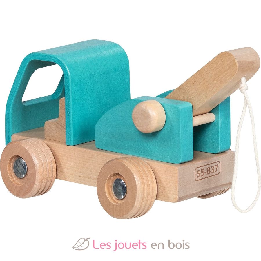 Abschleppwagen blau, Holzfahrzeuge der Marke Goki.