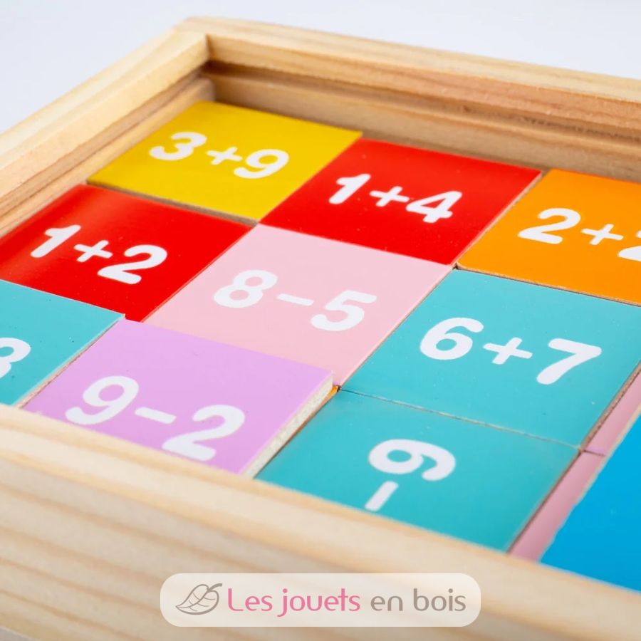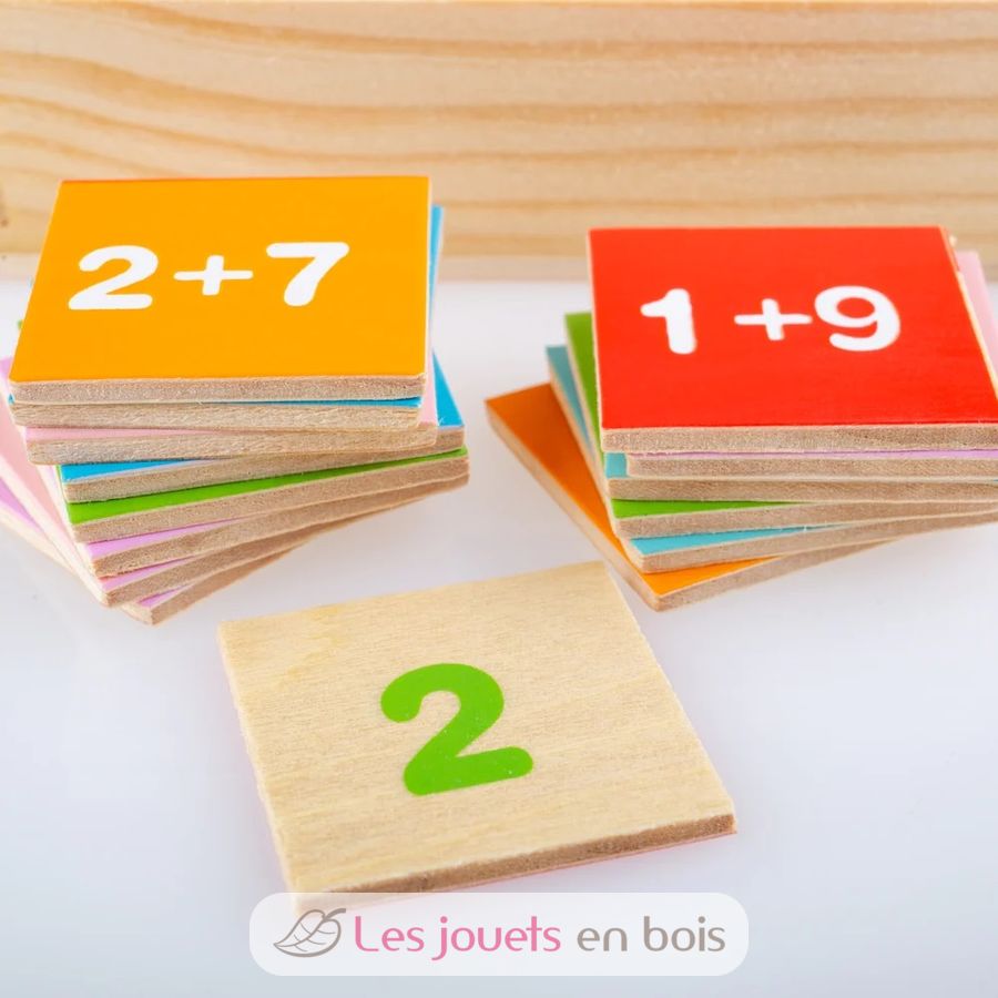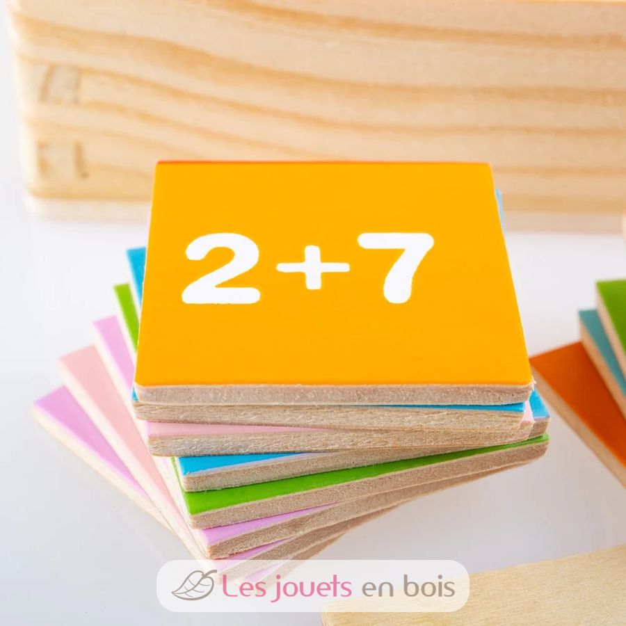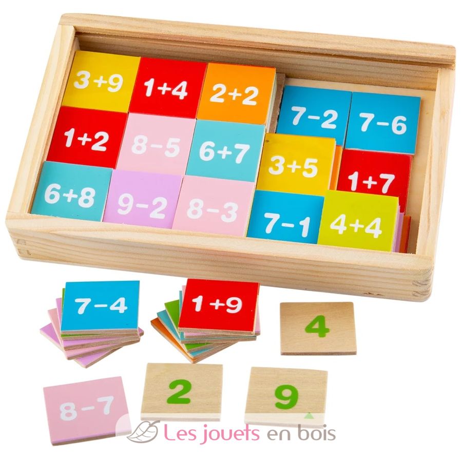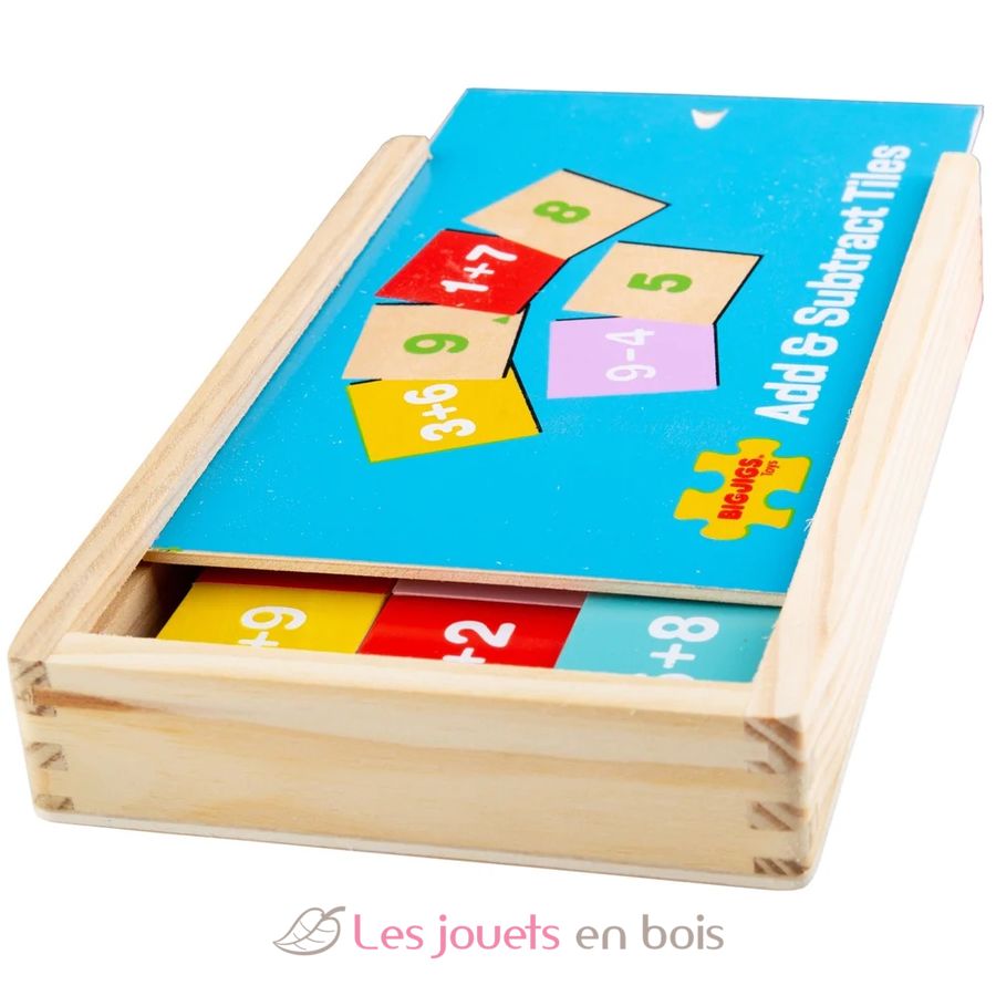Diese hölzerne Box zum Hinzufügen und Abziehen verfügt über bunte einzelne Holzfliesen, mit einer Kombination aus Additions- und Subtraktionssummen von Zahlen 1–9.