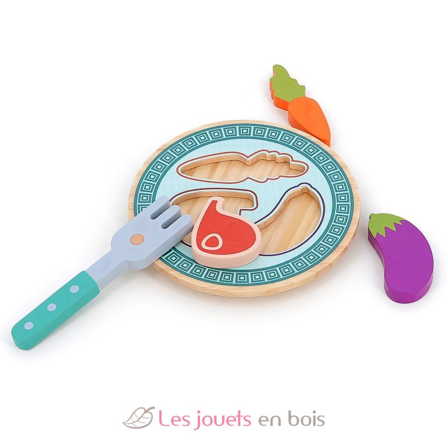 Zeit zum Essen! Dieses schöne, multifunktionale Holztablett bietet alles, was Sie brauchen: ein Maraca-Getränk, Brot zum Kratzen, Fleisch und Gemüse zum Stapeln, eine stapelbare Birne zum Essen und eine magnetische Gabel zum Greifen des Essens.