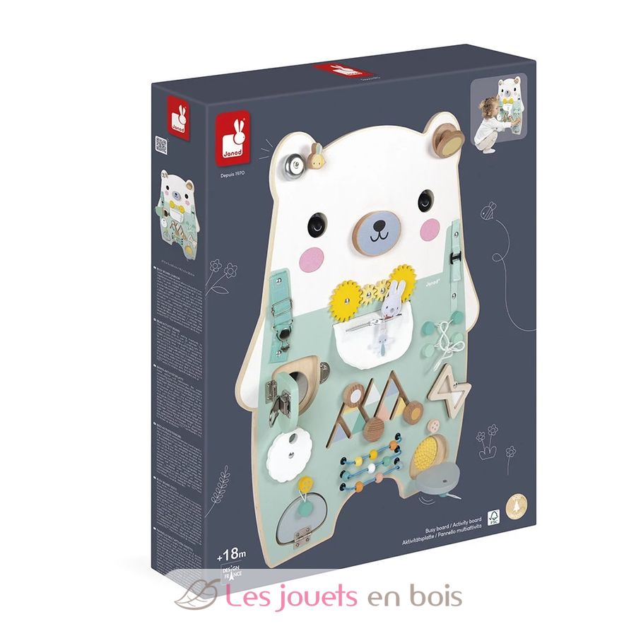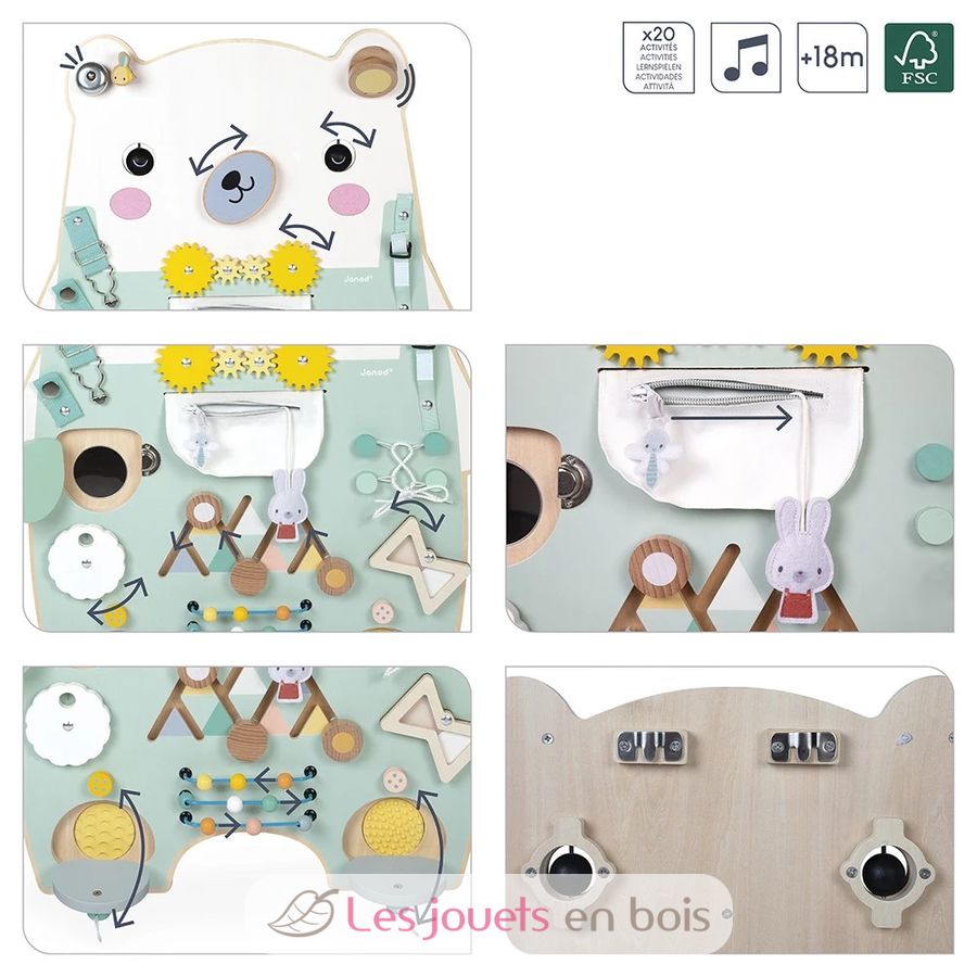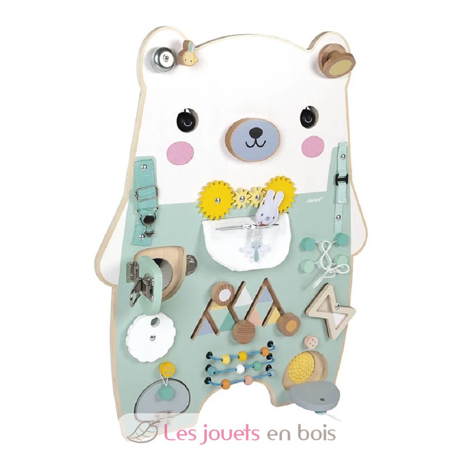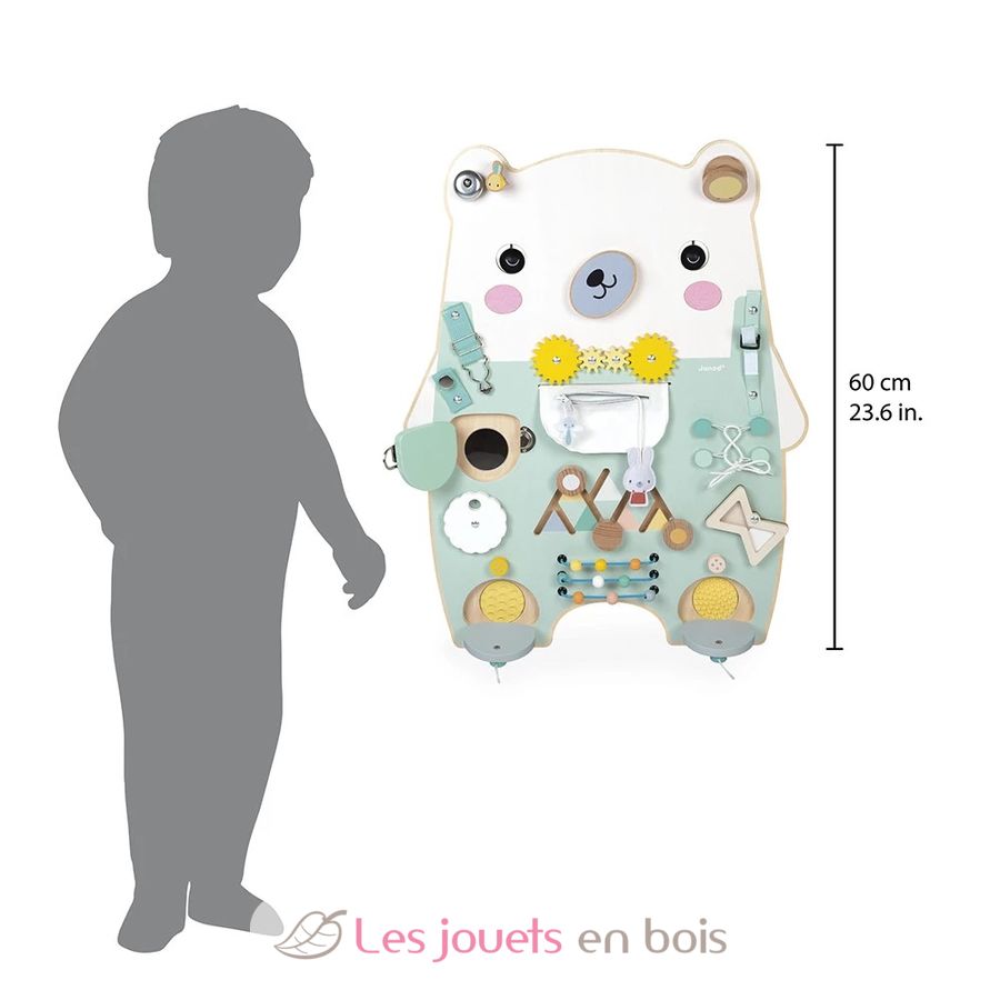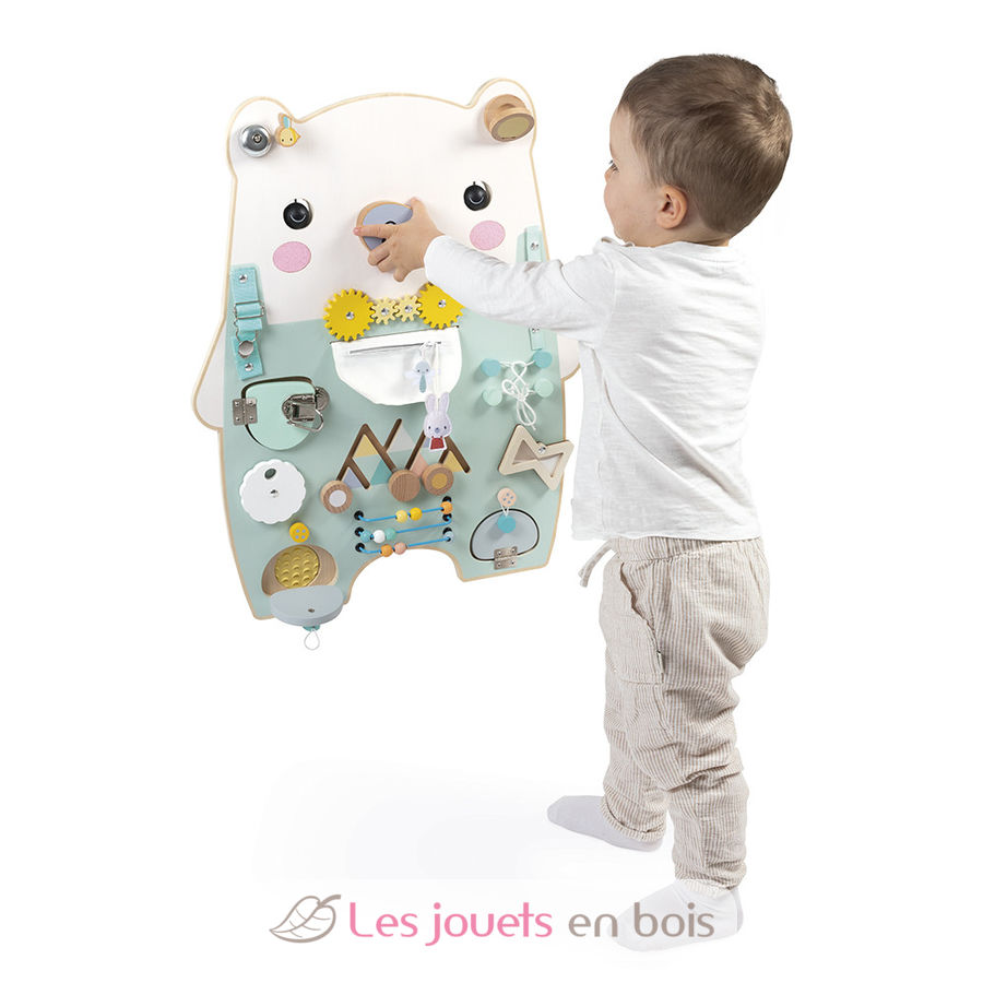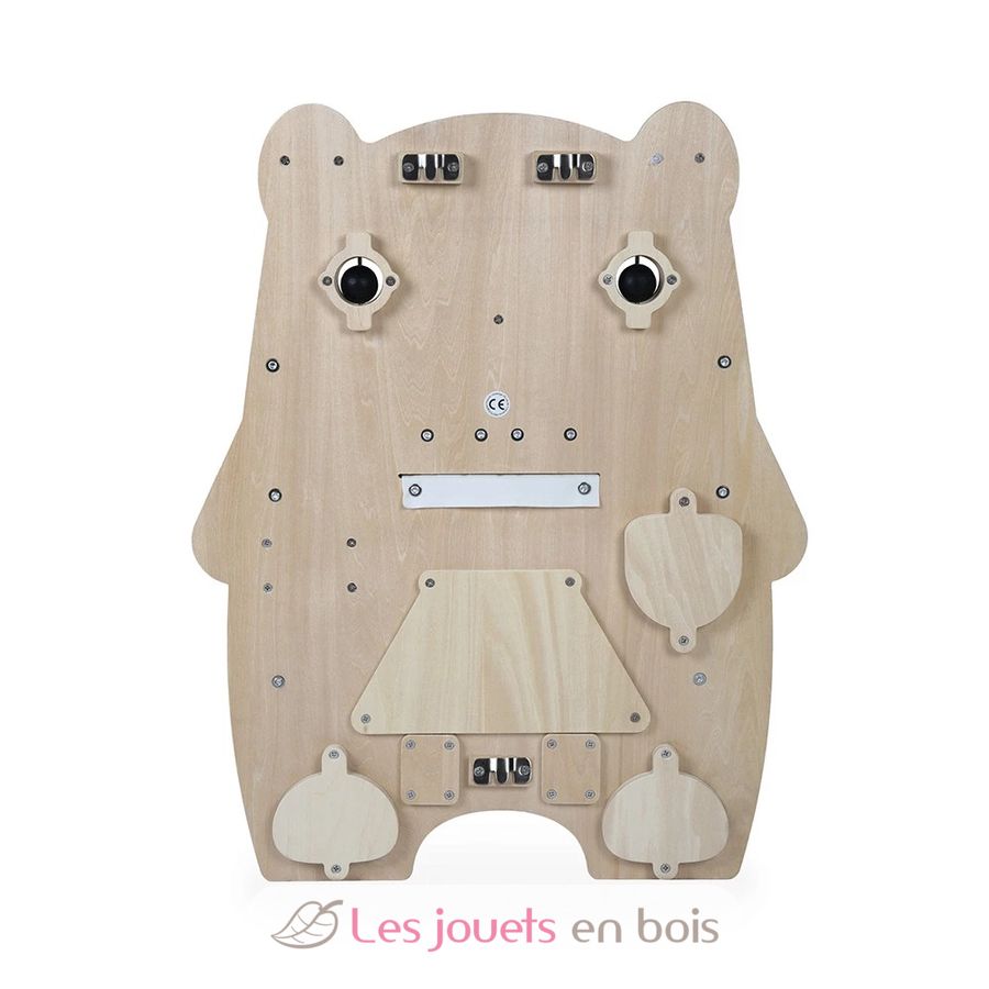 Bär-Arbeitsbrett zum Aufstellen oder Befestigen an der Wand. Bietet mehr als 20 unterhaltsame Lernspiele, perfekt zur Stimulation von Babys ab 18 Monaten.