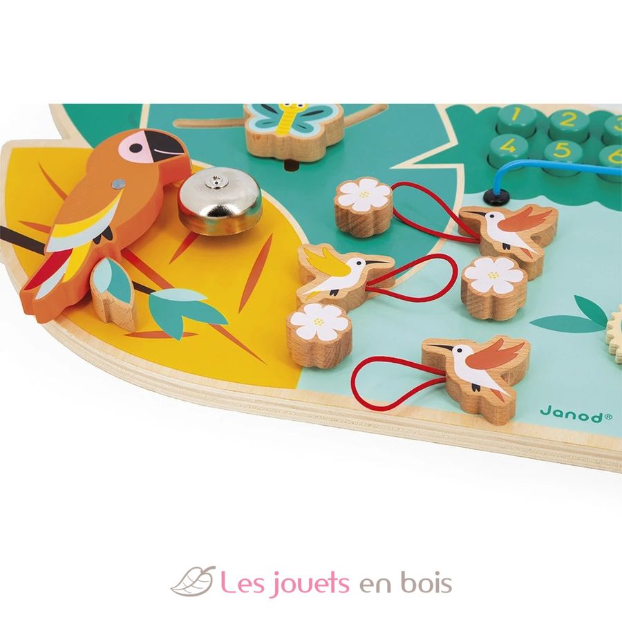 So viele taktile und akustische Freuden im Dienste der Feinmotorik des Babys. Und die verschiedenen, leicht zugänglichen Öffnungen sind praktisch, um das Anziehen zu üben. Es ist ein vielseitiges, umfassendes Lernspielzeug und perfekt für selbstständige Spielmomente. Das hölzerne Busyboard können Sie ganz einfach an der Wand befestigen. Dank seines tropischen Stils und seiner leuchtenden Farben wird es seinen Platz in einem Kinderzimmer finden.