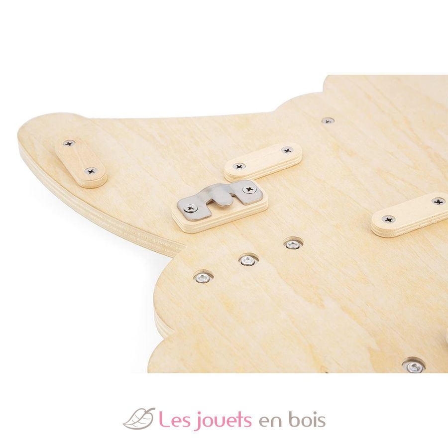 Auf dem Programm stehen: 1 Labyrinth mit 3 Elementen zum Anfassen, 1 akustisches Drehauge, 3 Gurte mit verschiedenen Verschlusssystemen (Reißverschluss, Klettverschluss, Plastik), 3 Chamäleon-Zahnräder, 1 Klingel, 1 Metallschloss, 1 versteckter Spiegel, 1 Abakus mit bunten Murmeln, Silikon- und Filzstrukturen zum Anfassen, Knöpfe zum Drücken, Gummibänder zum Befestigen ... Sie werden es verstehen, es sind Stunden voller Entdeckungen, die sich den kleinen Neugierigen bieten!