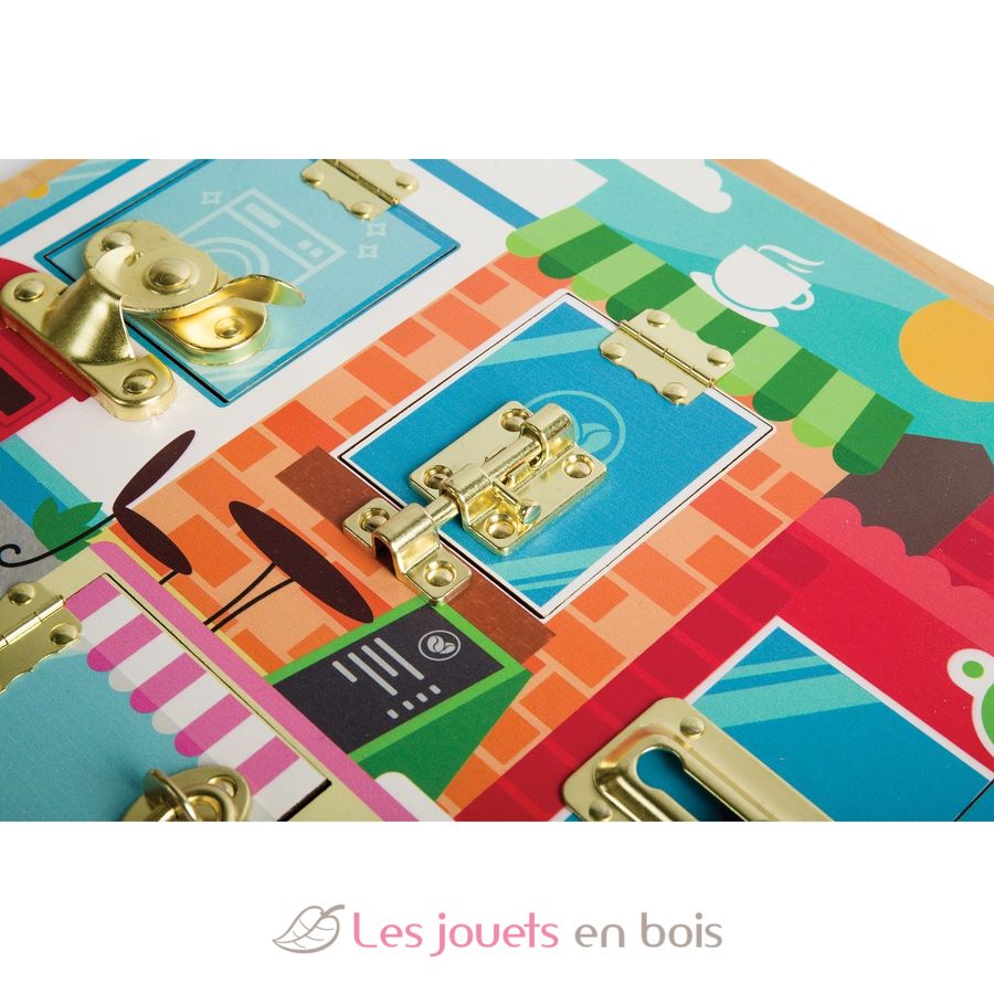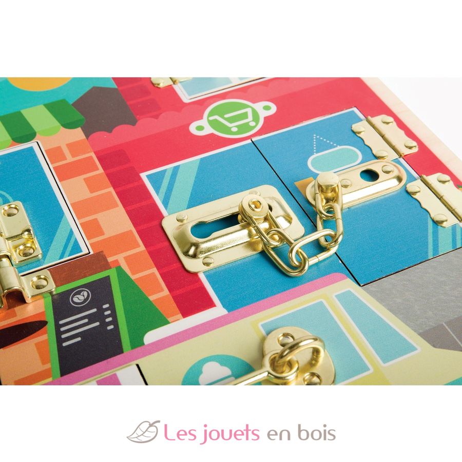 Sobald die Kinder das Öffnen der verschiedenen Schlösser beherrschen, verbirgt sich hinter jeder Tür dieses Montessori-Aktivitätsbretts eine detailreiche Szene. Entdecken Sie eine Wäscherei, eine Café-Küche, eine gemütliche Lounge, einen Briefsack, Supermarktregale und das Innere eines Eiswagens.