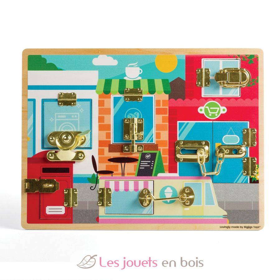 Aktivitätsspiel Verriegelungen und Schlösser von Bigjigs Toys.