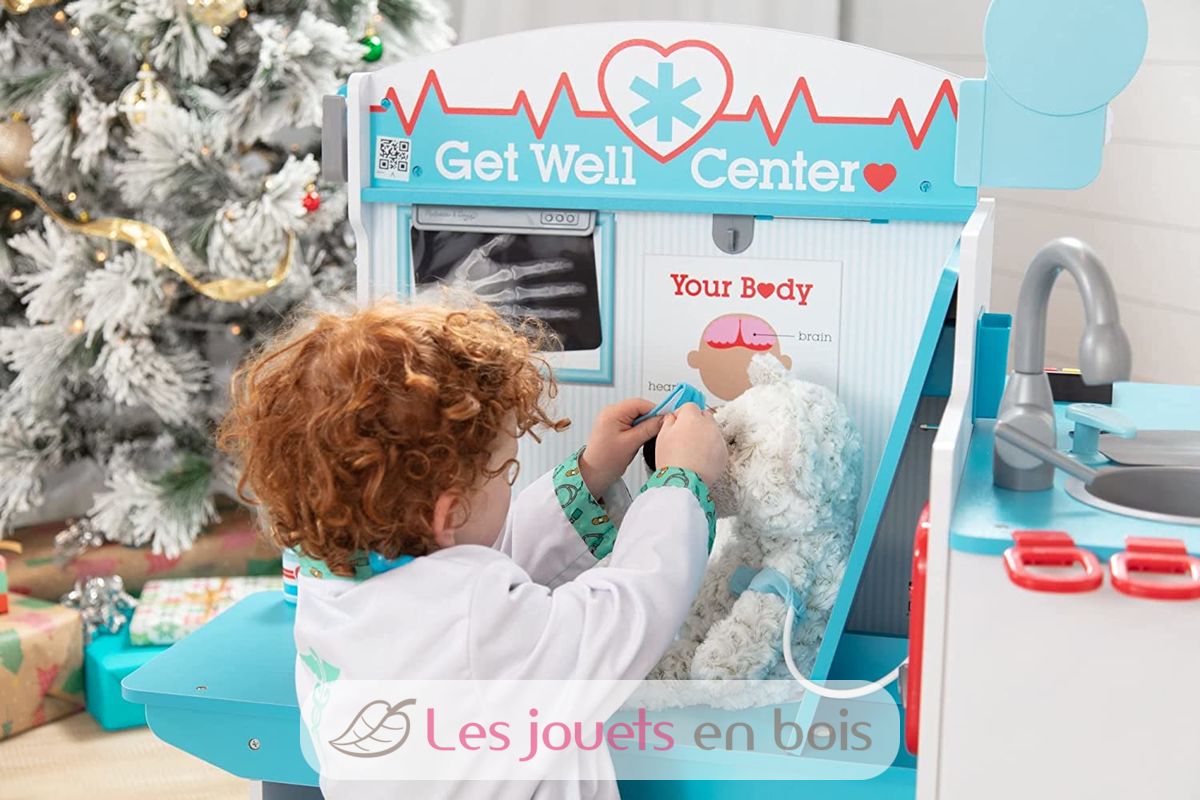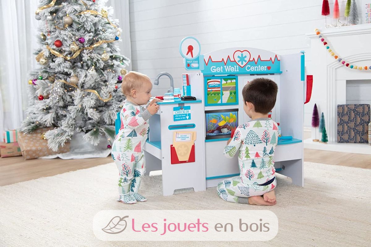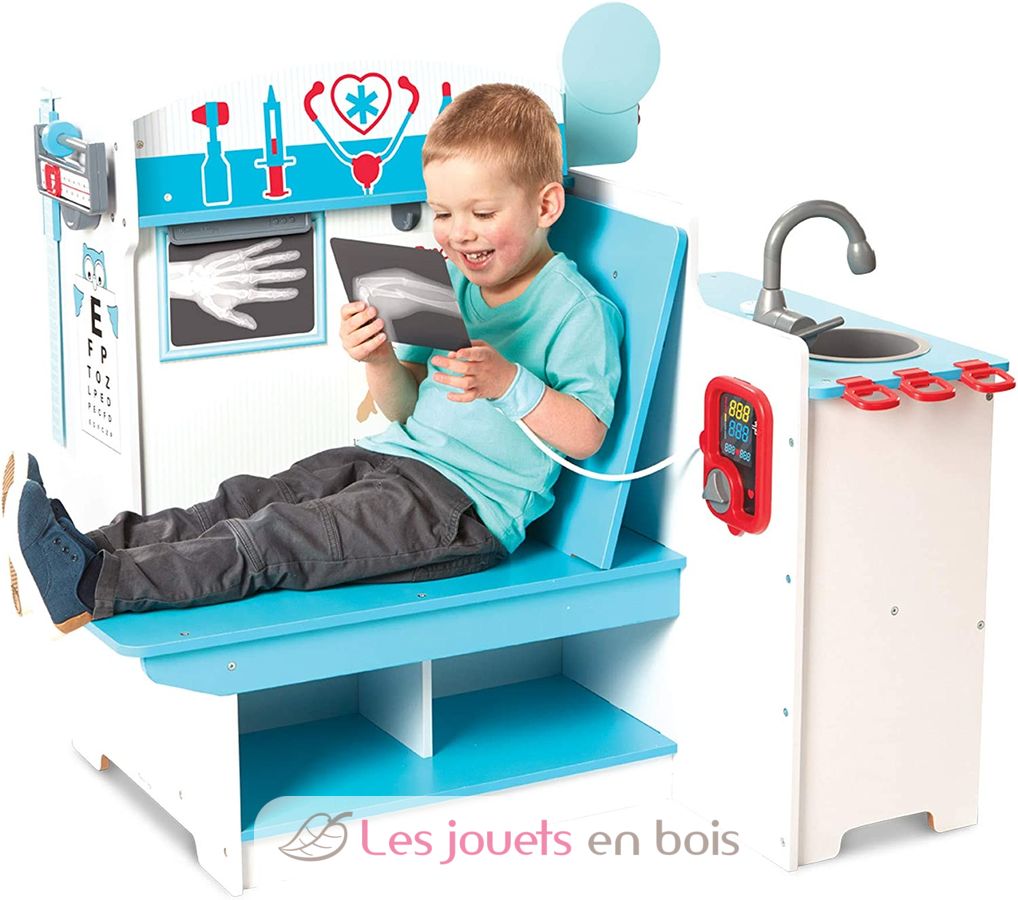 Mehrseitiges Arztpraxis-Spielzentrum aus Holz mit Wartebereich, Untersuchungsraum, Waschbecken und Empfangsbereich