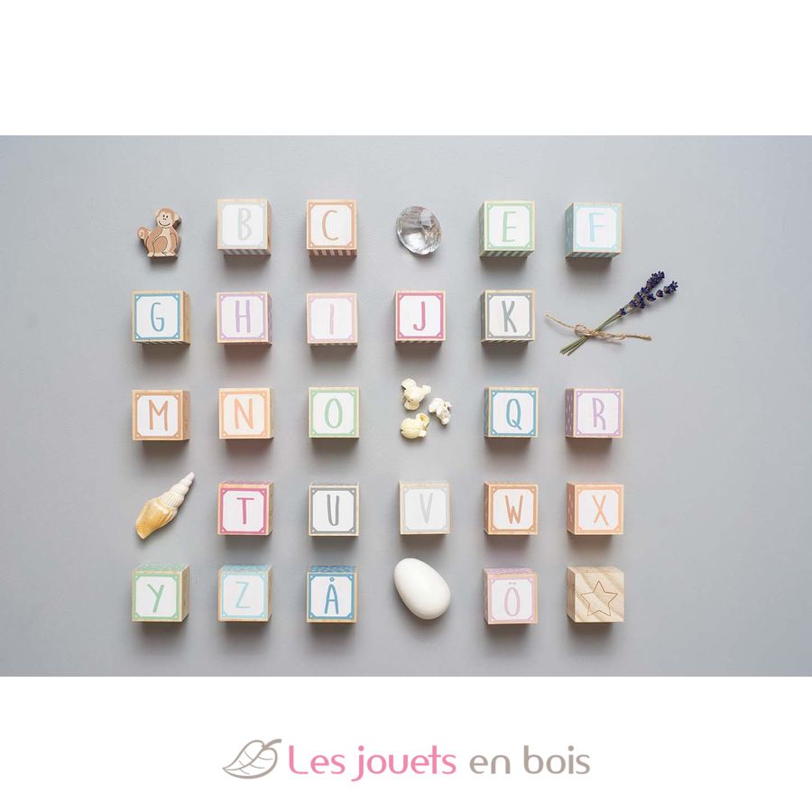 Dieses Spiel besteht aus 30 Würfeln massiven Holz (4 cm). Diese Würfel sind bei Kindern sehr beliebt, weil sie das Komponieren von Wörtern, aber auch das Spielen zum einfachen Bauen, Stapeln und Sortieren ermöglichen. Das Spiel passt problemlos in eine Stofftasche, die zusammen mit den Würfeln angeboten wird.