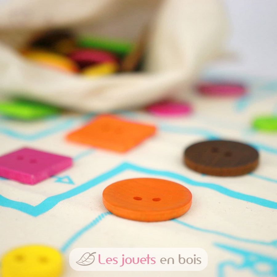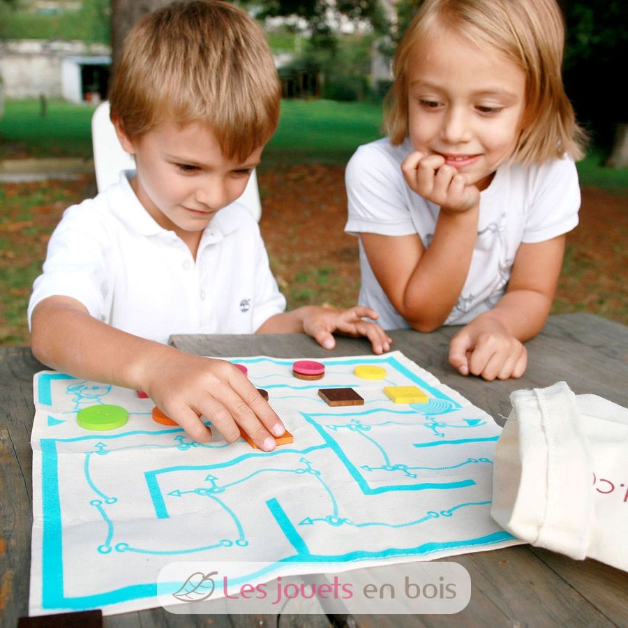 Dieses Holzbrettspiel enthält eine Labyrinthmatte und eine Tasche mit 45 Holzknöpfen, die alle unterschiedlich sind (in Form, Form und Größe). Die Spieler kommen voran, indem sie einen Knopf nach dem anderen platzieren, wenn sie die gleiche Form, Farbe oder Größe wie der vorherige haben. Es ist ein Tast- und Assoziationsspiel, eine unterhaltsame Herausforderung für die ganze Familie. Außerdem hat es eine vereinfachte Version für jüngere Spieler.