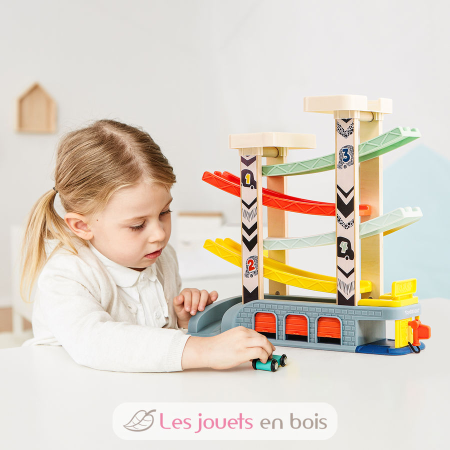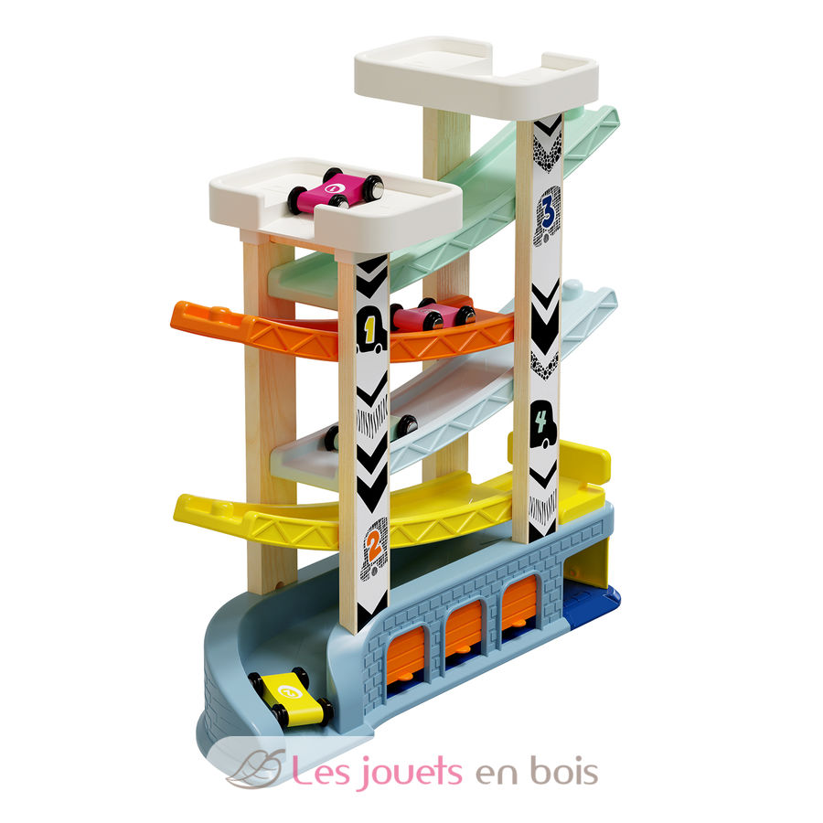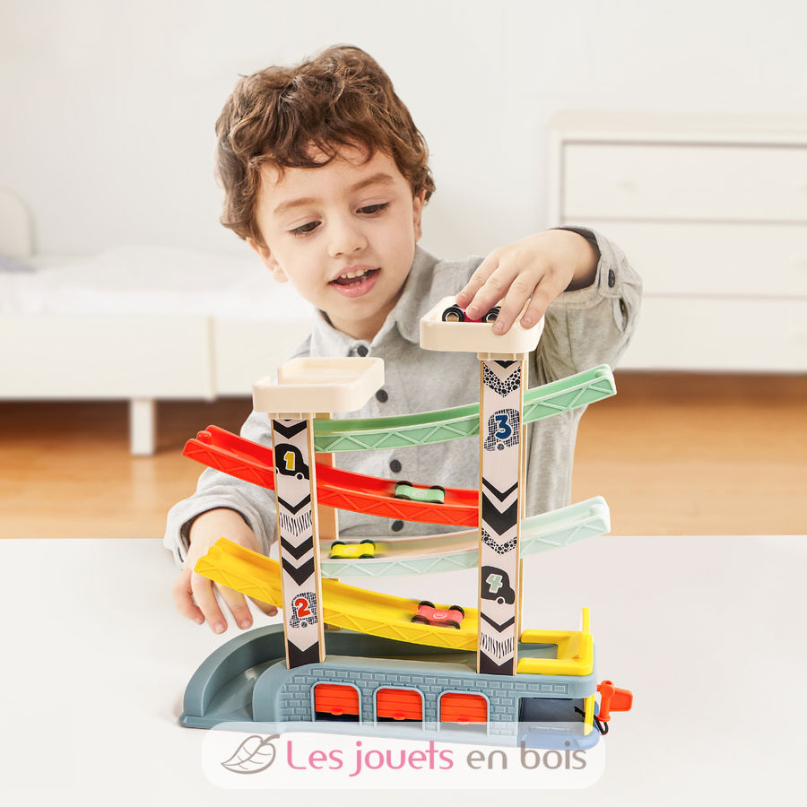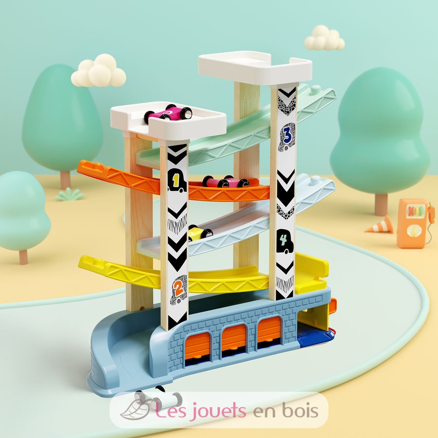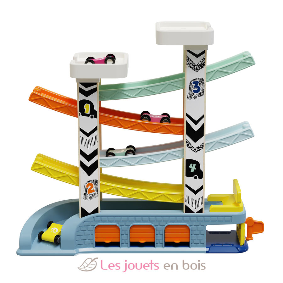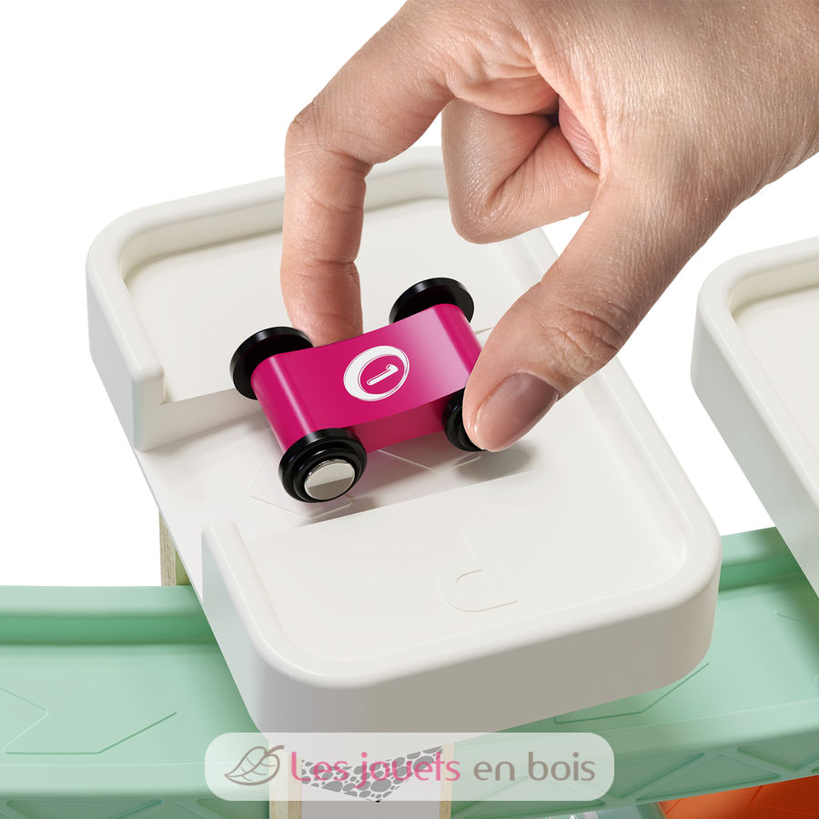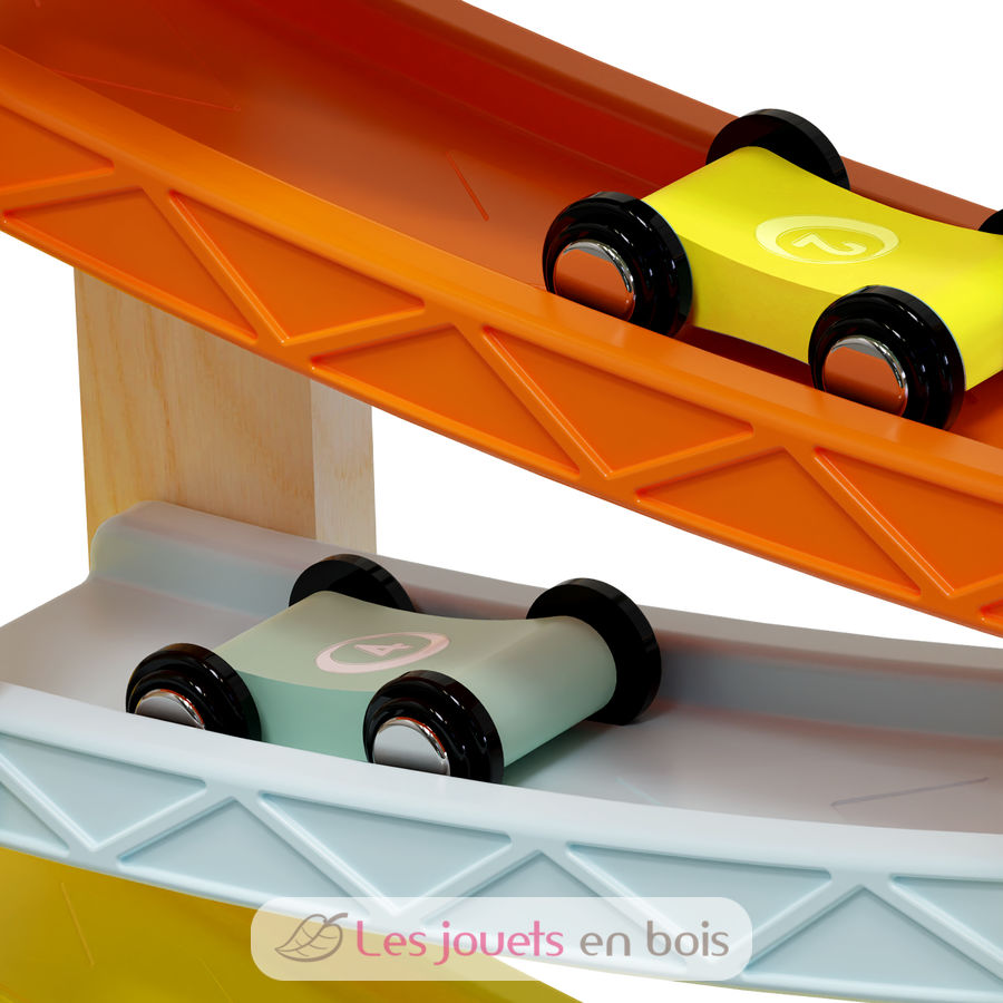 Auf die Plätze, fertig, Abfahrt! Diese Rennbahn verspricht rasante Action, wenn die vier kleinen autos die Rampen hinuntersausen.
