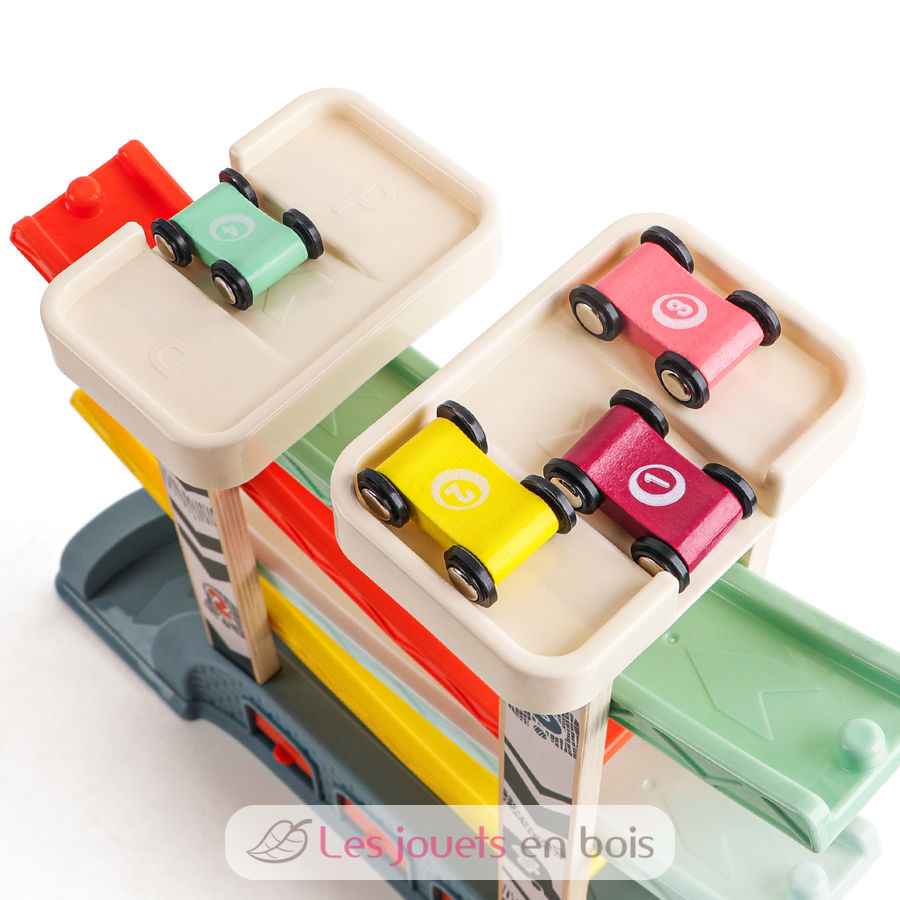 4 Rennwagen, 4 schnelle Rampen, 2 Parkdecks, 3 Garagenplätze, eine Tankstelle- und das Autorennerlebnis ist komplett.