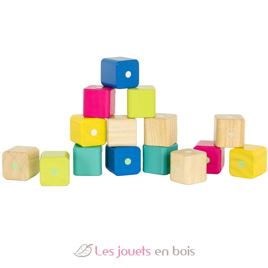 Dieses Set enthält 15 magnetische Holzbausteine, die sich für kleine Hände leicht stapeln lassen.