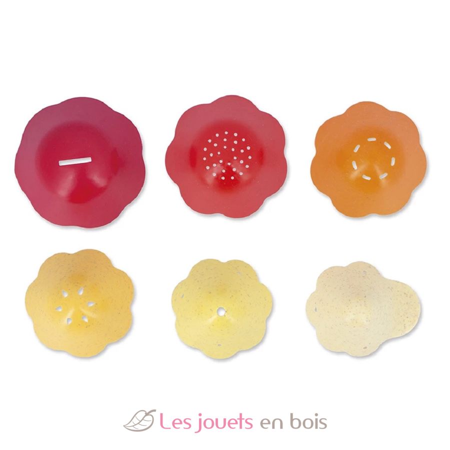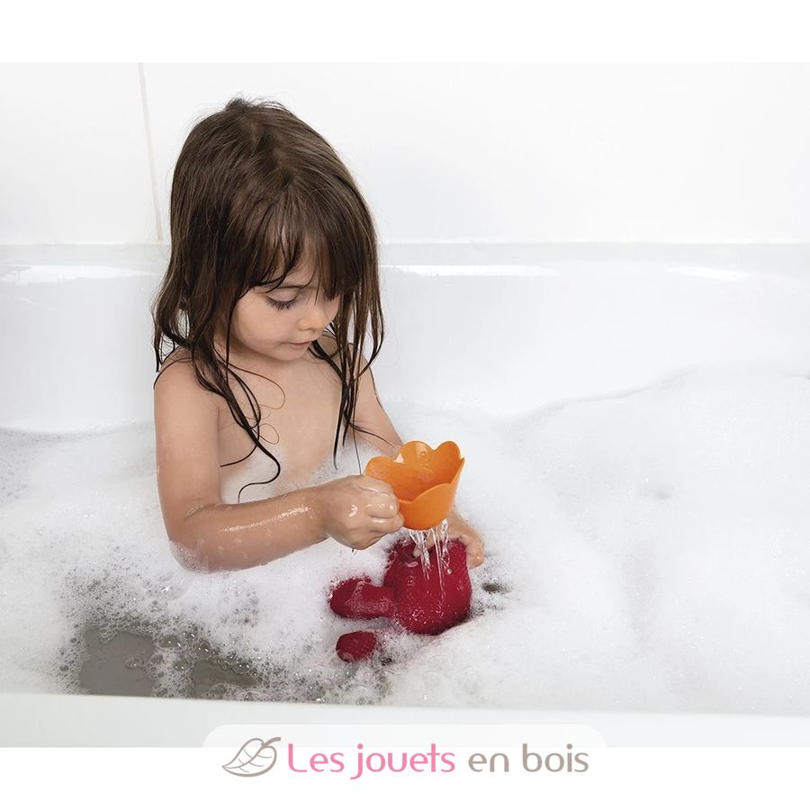 Dieses Badespiel besteht aus einem Badeschwamm und 6 bunten Schalen und bietet verschiedene Spielmöglichkeiten: Die Kinder können sich damit vergnügen, alle Schalen von der größten bis zur kleinsten auf Bernhards Kopf zu stapeln, um seine Muschel zu rekonstruieren, aber auch das Wasser durch die verschiedenen Öffnungen der Becher fließen zu lassen. Sie bieten jeweils unterschiedliche Löcher für immer neue Überraschungen - und um Bernard zu begießen! Einer der Becher ist übrigens eine kleine Kelle mit Stiel, mit der man das Umfüllen spielen kann. Das ist alles, was Kinder lieben!