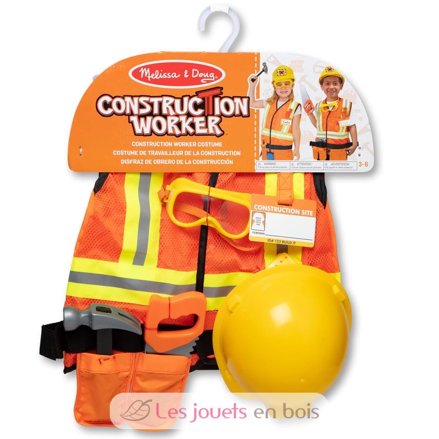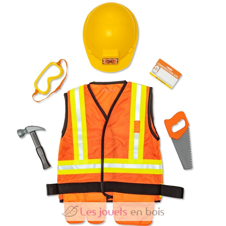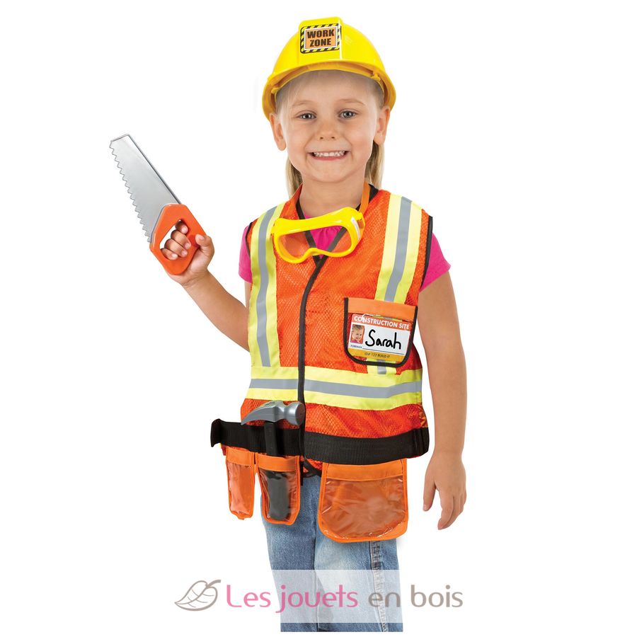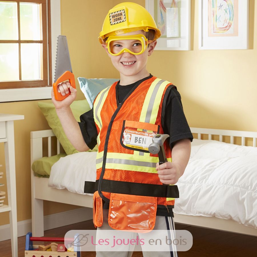 Enthält: eine hellorange-maschinenwaschbare Weste mit reflektierendem Material, einen Werkzeuggürtel, einen gelben Helm, eine Schutzbrille, einen Hammer, eine Säge und ein Etikett zum Anpassen der Vornamenverkleidung des Kindes.