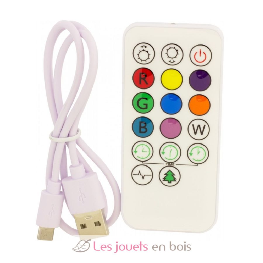 Die Kontrollleuchte ist batteriebetrieben. Das Aufladen erfolgt über das USB-Kabel (mitgeliefert), das an ein USB-Gerät oder ein universelles Ladegerät (Typ Handy-Ladegerät) angeschlossen wird. Mit der Fernbedienung (im Lieferumfang enthaltener Akku) können Sie auf zusätzliche Funktionen zugreifen. Zum Beispiel die Timer-Funktion (15, 30 oder 60 Minuten).