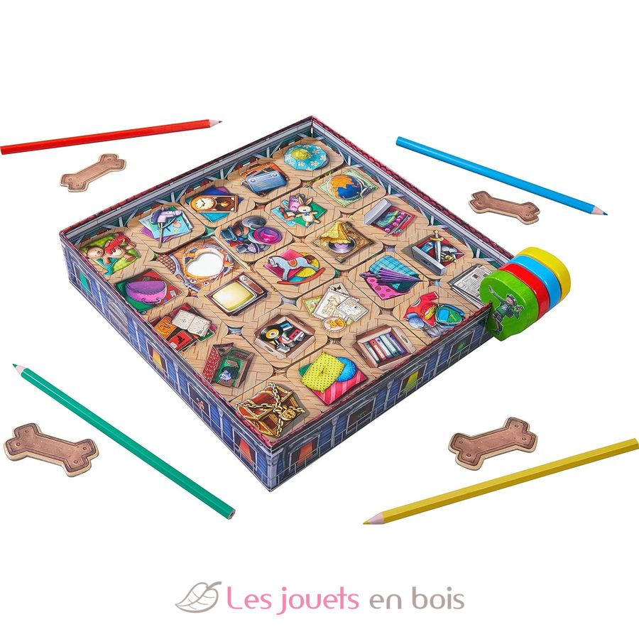 1 Dachboden (bestehend aus: Schachtelboden, Einleger, Steckkreuz aus 4 Teilen, 1 Boden-Spielplan,1 Monster-Spielplan, 24 Gegenstands-Plättchen), 10 weiße Blätter, 4 Spielfiguren, 4 Buntstifte, 4 Knochen-Plättchen, 1 Spielanleitung.