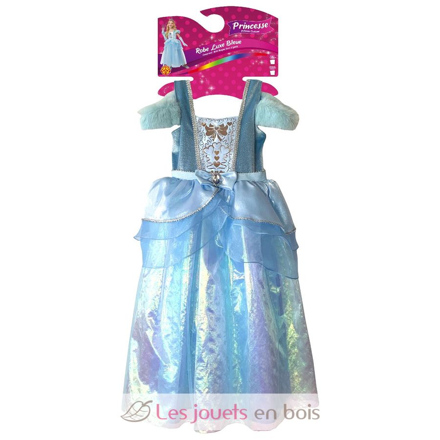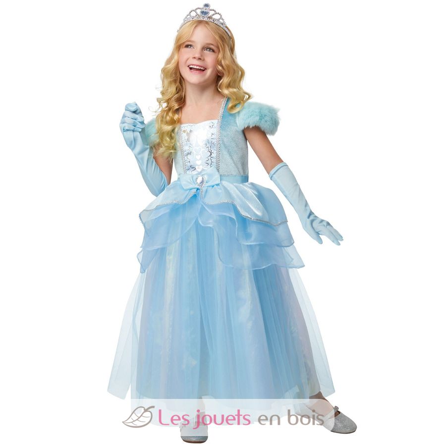 Dieses Kinderkostüm besteht aus einem glitzernden blauen Prinzessinnenkleid, einem Diadem und Handschuhen.