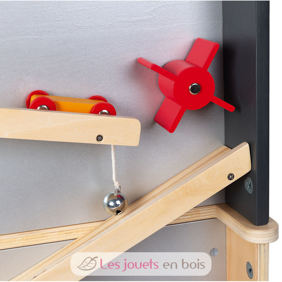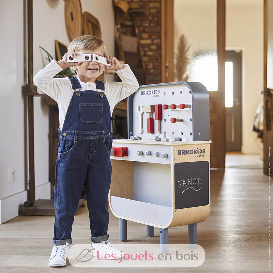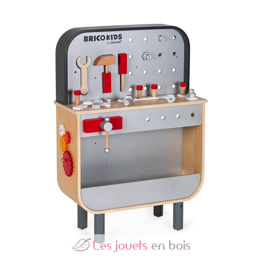 Leidenschaftliche Handwerker wollen immer mehr erschaffen! Janod stellt Ihnen deshalb die neue doppelseitige Werkbank-Generation vor: die Reverso-Werkbank! Ideal für Kinder von 3 bis 8 Jahren ist diese tolle Werkbank aus Holz sowohl schön als auch umfangreich ausgestattet! Sie ist aus Formholz gefertigt und sehr originell, denn man kann sie von beiden Seiten benutzen. Auf der Vorderseite befindet sich eine vollständig ausgestattete magnetische Werkbank mit einem cleveren System aus magnetischen Werkzeugen, damit das Material immer an der richtigen Stelle aufbewahrt wird. Außerdem sind viele Zubehörteile vorhanden, um Gegenstände zu erfinden, die immer wieder neu montiert und zerlegt werden können. Dazu gehören auch 3 magnetische Werkzeuge, 29 Zubehörteile (Muttern, Schrauben, Holznägel, Plättchen, Kreide), 1 Schraubstock, 1 Zahnradsystem und 1 Tafel (an der Seite), um mit der Kreide zu schreiben. Alle Zubehörteile lassen sich auf der Vorderseite, an der dafür vorgesehenen Stelle verstauen. Auf der Rückseite befindet sich eine Abfahrt aus vier Strecken mit zwei Autos, die abwechselnd den Hang hinabsausen und dabei die Räder drehen und die Glöckchen zum Klingeln bringen! 34 Zubehörteile sind insgesamt in dieser Designwerkbank aus Holz enthalten.