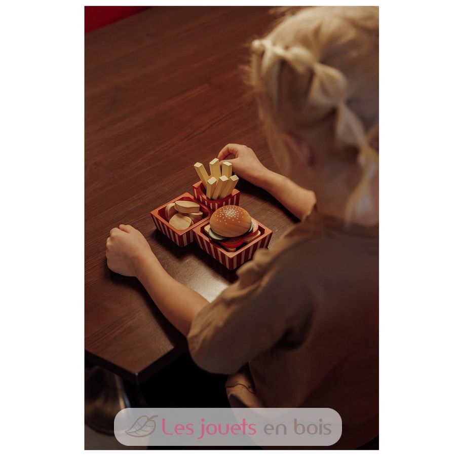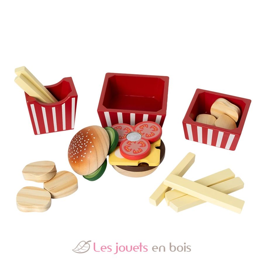 Das Set beinhaltet einen realistischen Holzburger, ein saftiges Hähnchenstück und knusprige Pommes frites, alles ordentlich verpackt in drei rot-weiß gestreiften Behältern für noch mehr Spielspaß und Authentizität. Kinder können ihre eigenen Burger kreieren, knusprige Pommes servieren und sogar die Zutaten austauschen, um jedes Mal eine neue Kreation zu erschaffen.