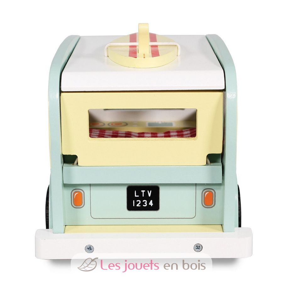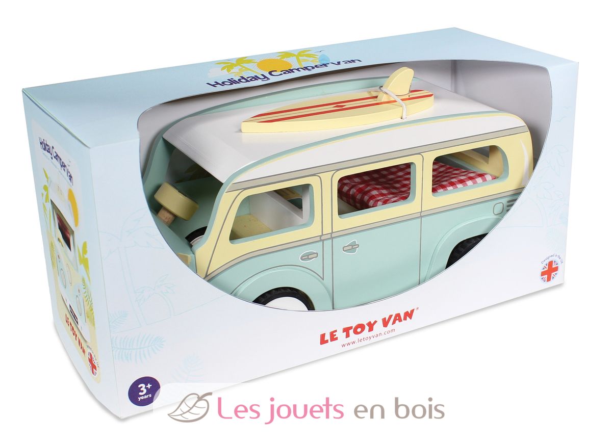 Entdecken Sie den Oldtimer-Campingwagen von Le Toy Van! Ein Holzfahrzeug für Kinder ab 3 Jahren, ein Surfer-Van, der Urlaubswünsche vermittelt! Dieses schöne Wohnmobil verfügt über ein abnehmbares Surfbrett. Während Sie das Dach heben, entdecken Sie ein Bett mit gepolsterter Matratze und eine Küchenzeile. Ihr Kind wird in der Lage sein, seine Lieblingscharaktere einzufangen und wird schöne Geschichten von Flucht und Urlaub erfinden.