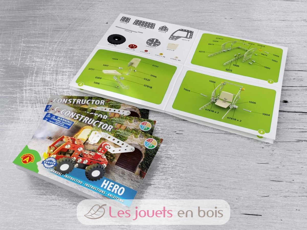 Ein Bausatz aus verchromtem Metall mit farbigen Kunststoffteilen, die mit Schrauben und Muttern zusammengebaut werden. 100% in Europa hergestellt. Ab 8 Jahren.