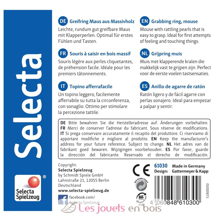 Dieser leichte Klappern der Mausohren, leicht zu fassen ist ideal für die ersten gropings. Spielwaren in Deutschland von Selecta gemacht. Ref. 1410