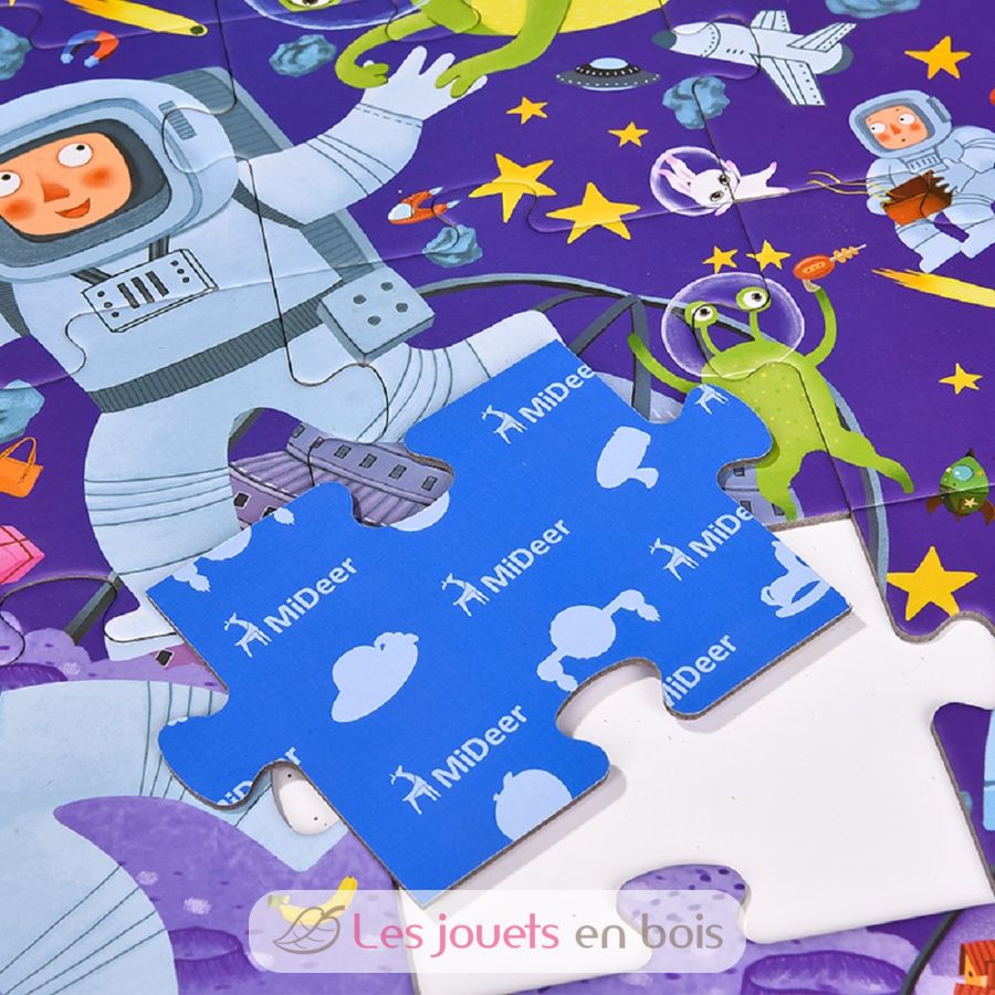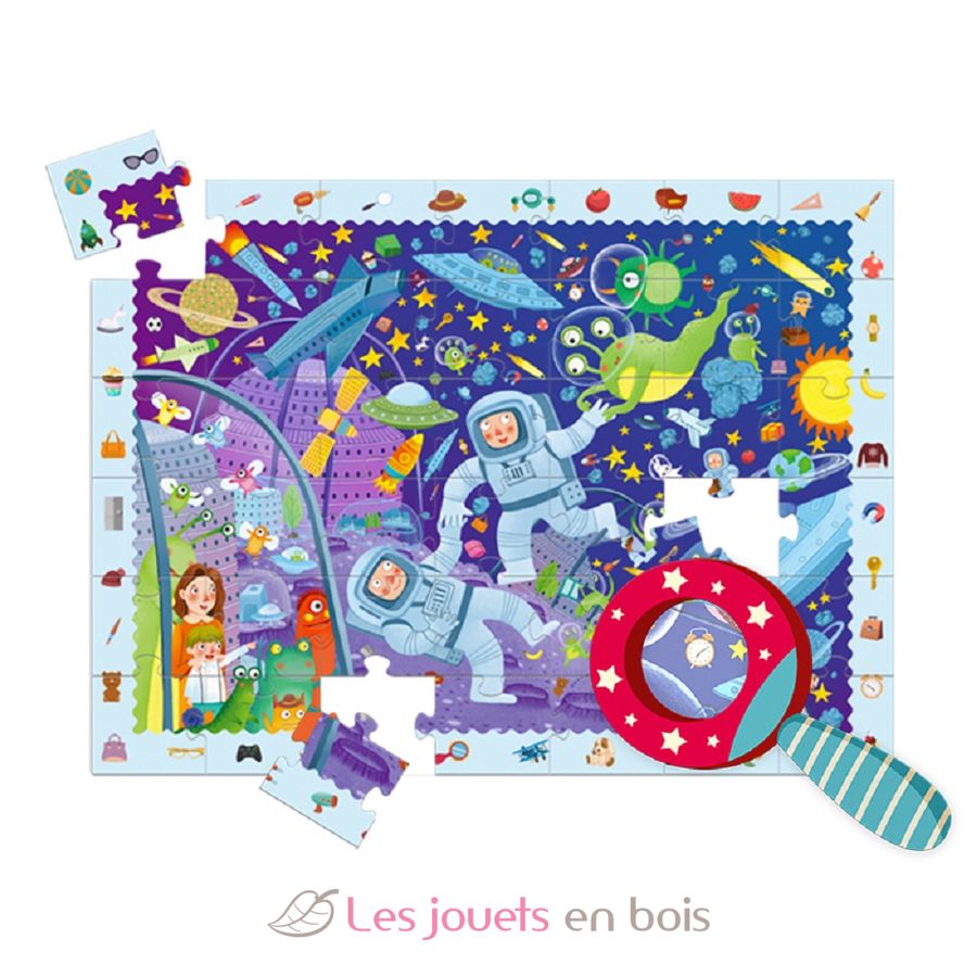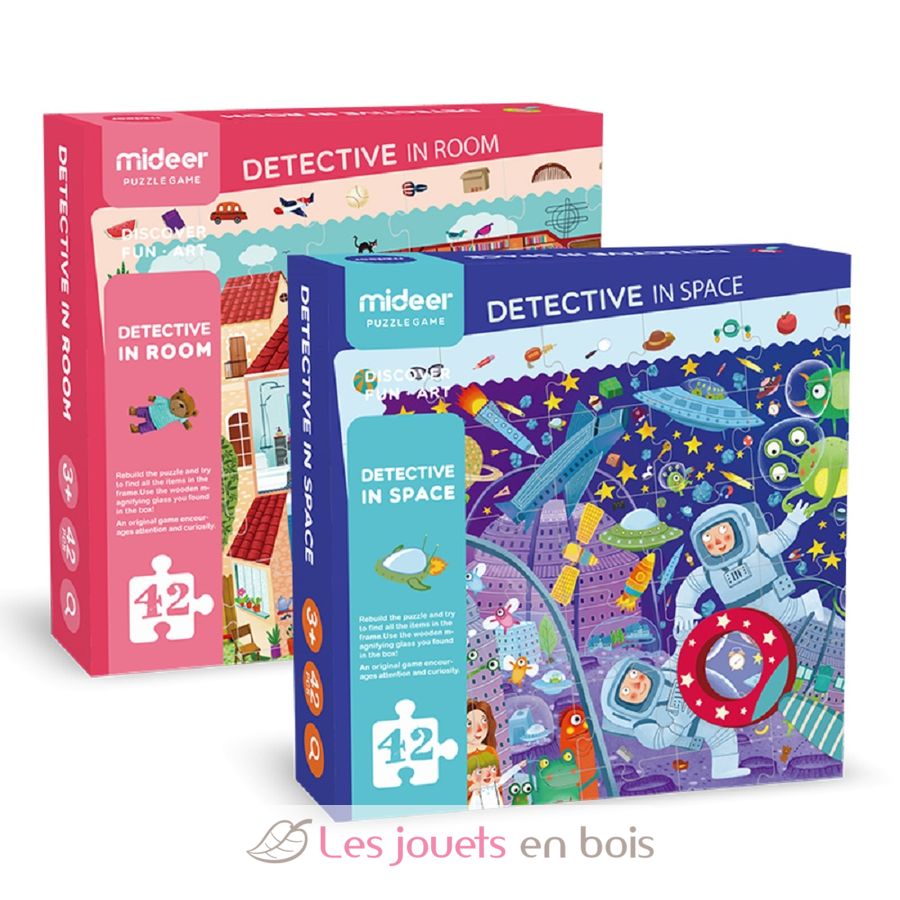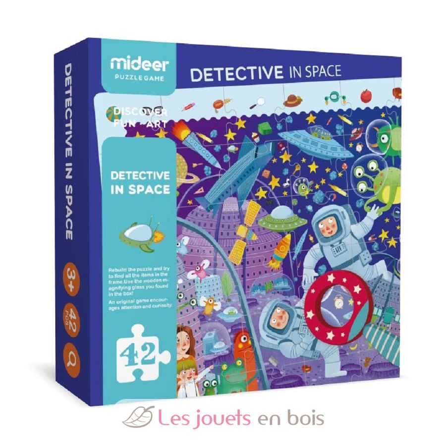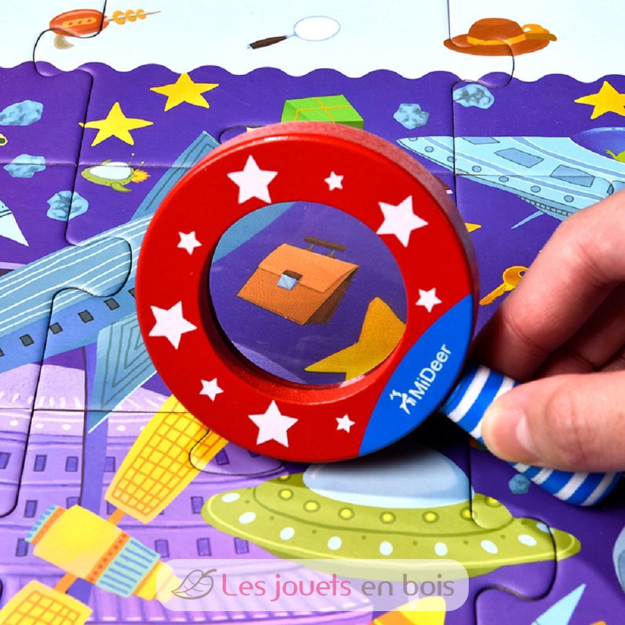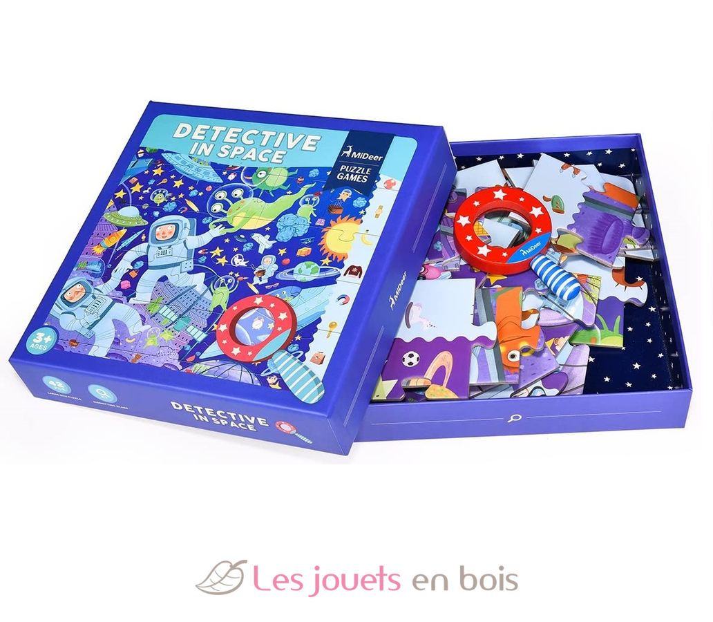 Schöne Schachtel mit einem Papppuzzle aus 42 Teilen. Sobald der Junge sein Puzzle zusammengesetzt hat, verwendet er die hölzerne Lupe des Detektivs, um die im Puzzle versteckten Objekte zu finden. Abmessungen: 70 x 52 cm.
