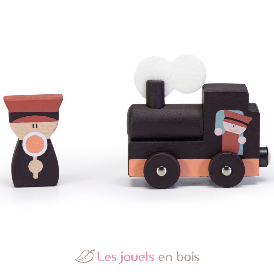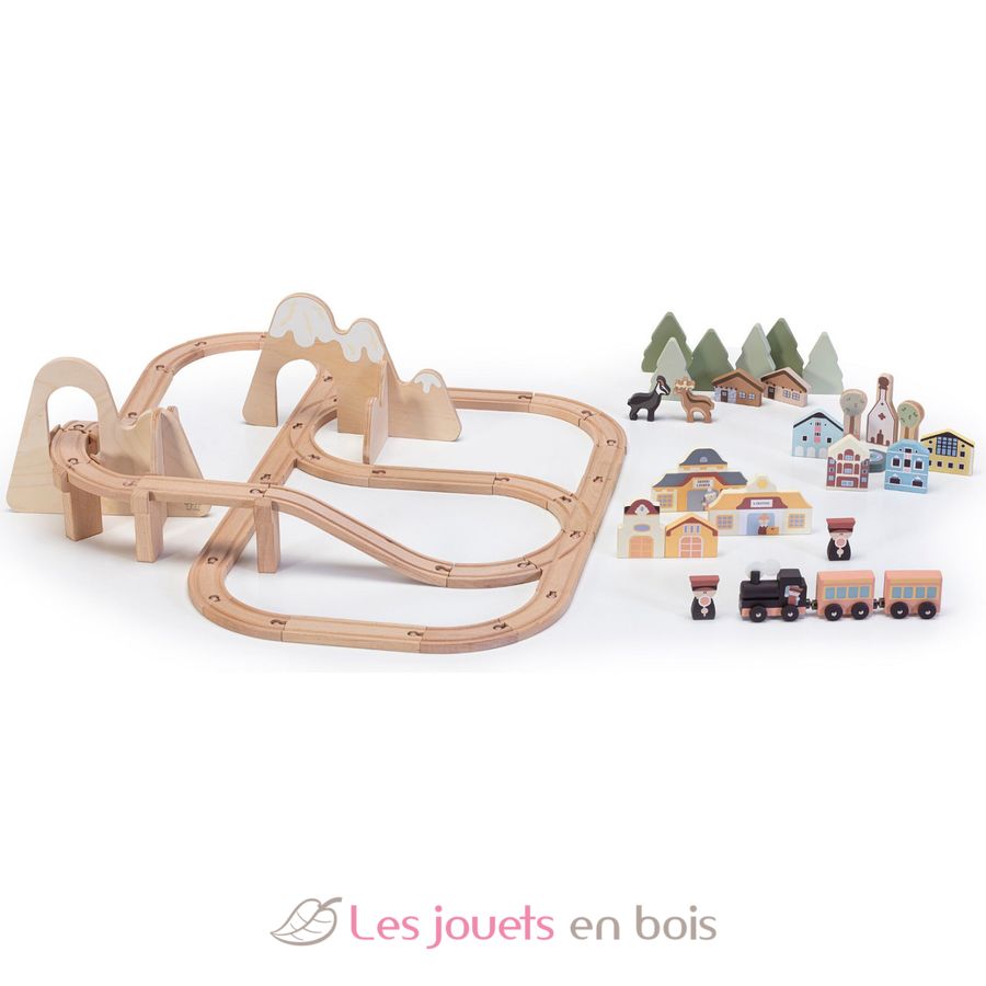 Dieses Holzeisenbahnset besteht aus 65 Teilen, darunter 34 für die Gleise und eine Lokomotive mit zwei Waggons.
