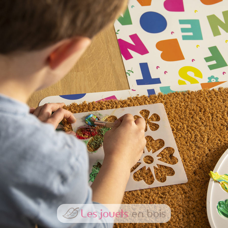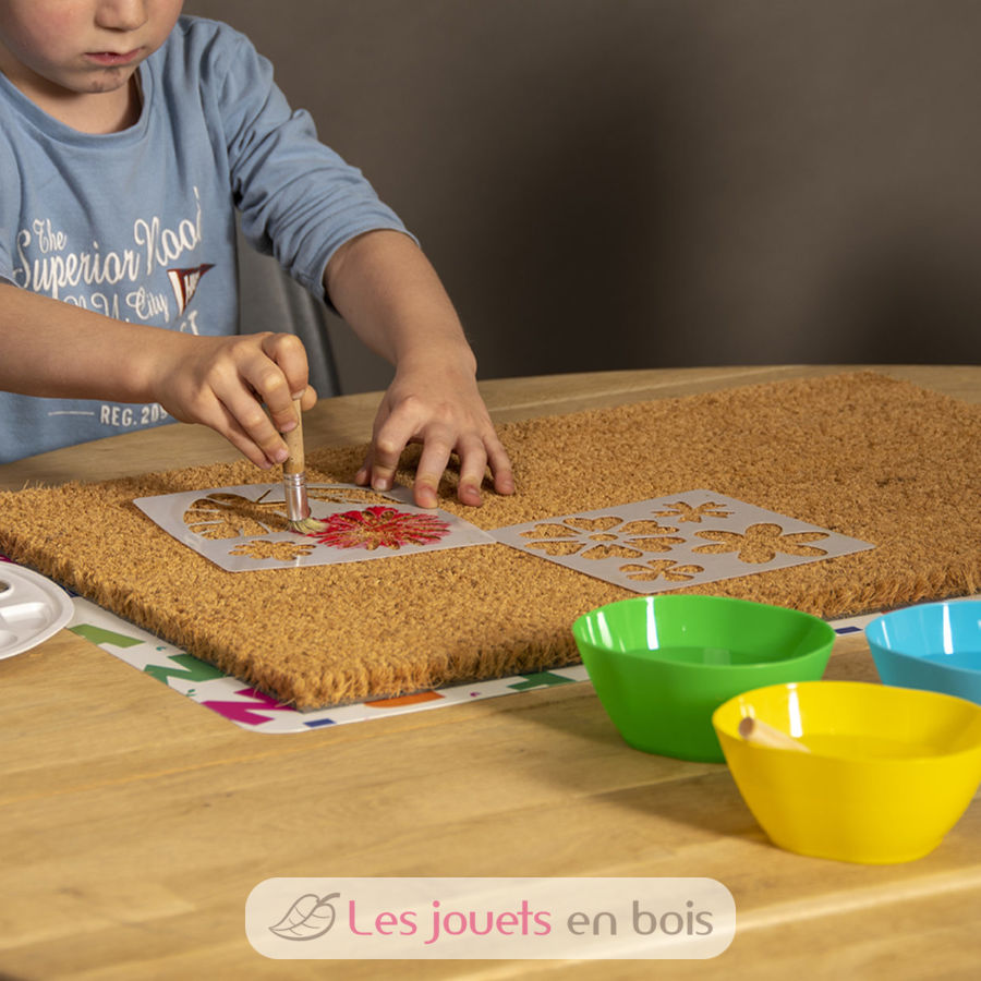 Dieses Set besteht aus einer Kokos-Türmatte (60 x 40 cm), Schablonenblättern, einem Pinsel und Türmatten-Farbe. Mit etwas Fantasie und diesem Set gestalten Sie die schönsten Türmatten.