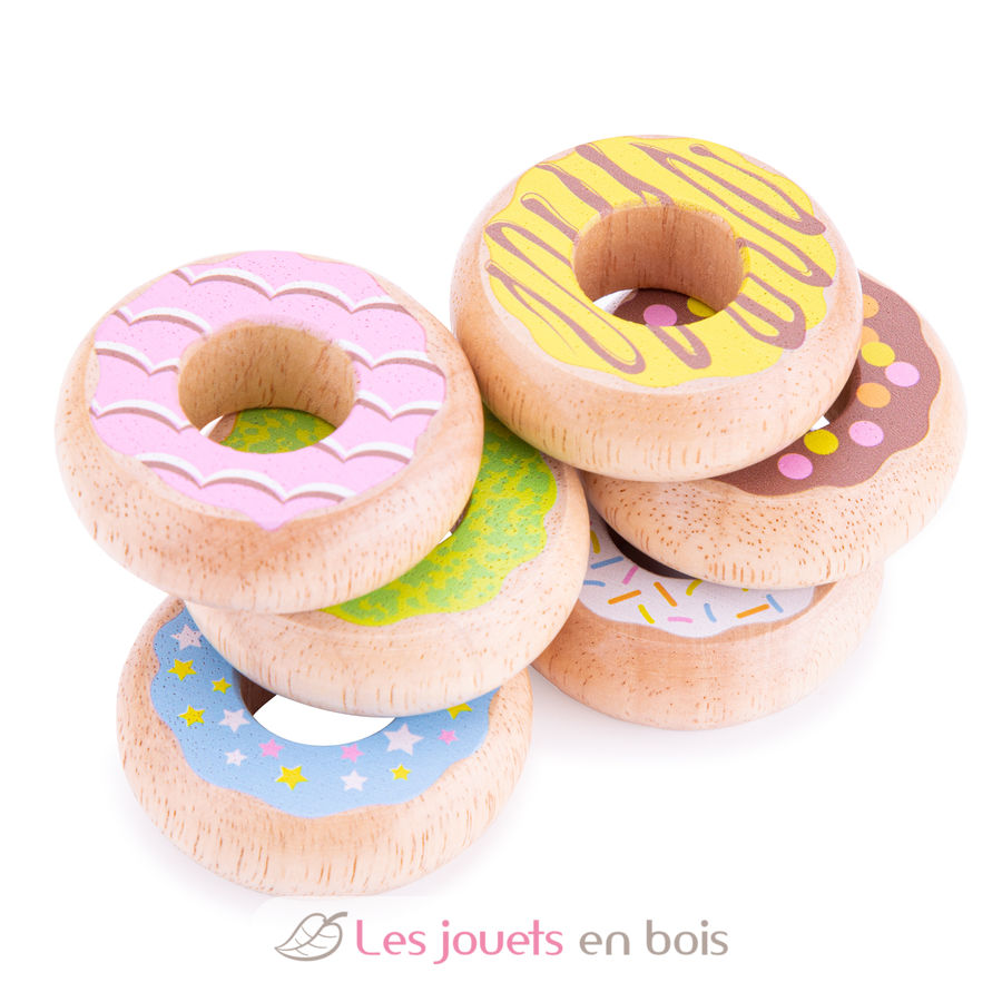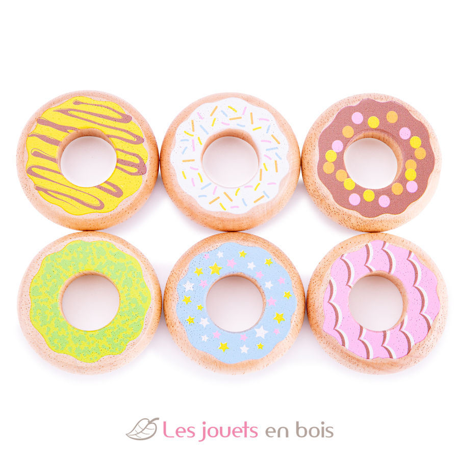 Ein Set mit sechs wunderschönen bunten Donuts aus Holz.