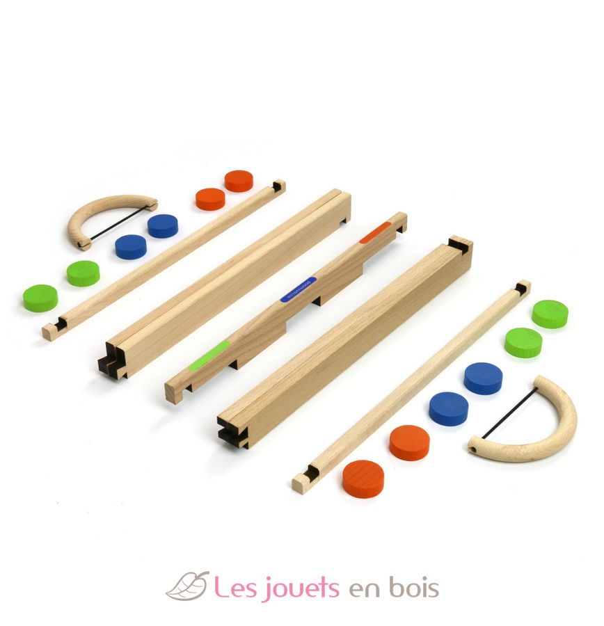 Inhalt: ein Spielplatz zum Zusammenbauen (61 x 31 cm), 2 Bögen (2 Halbmonde mit Gummibändern), 12 Holzscheiben in 3 Farben und eine Aufbewahrungstasche aus Baumwolle.