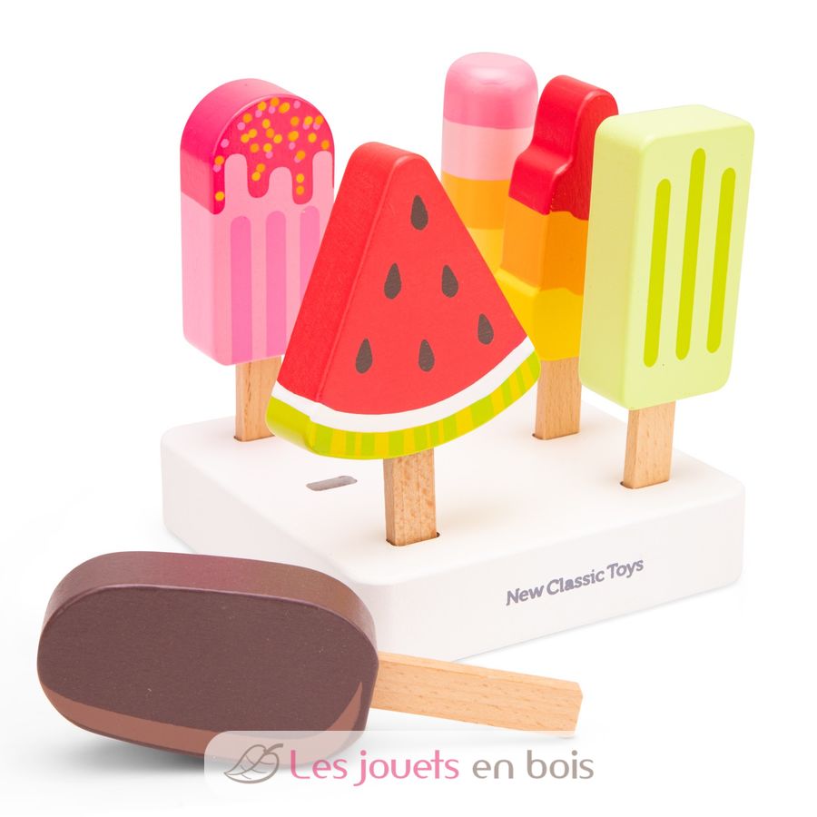 Ein Set aus 6 Eis am Stiel aus Holz, geliefert mit einem Holzständer, ideal zur Vervollständigung eines Essplatz-Sets für Kinder und zum Spielen von Händlern.