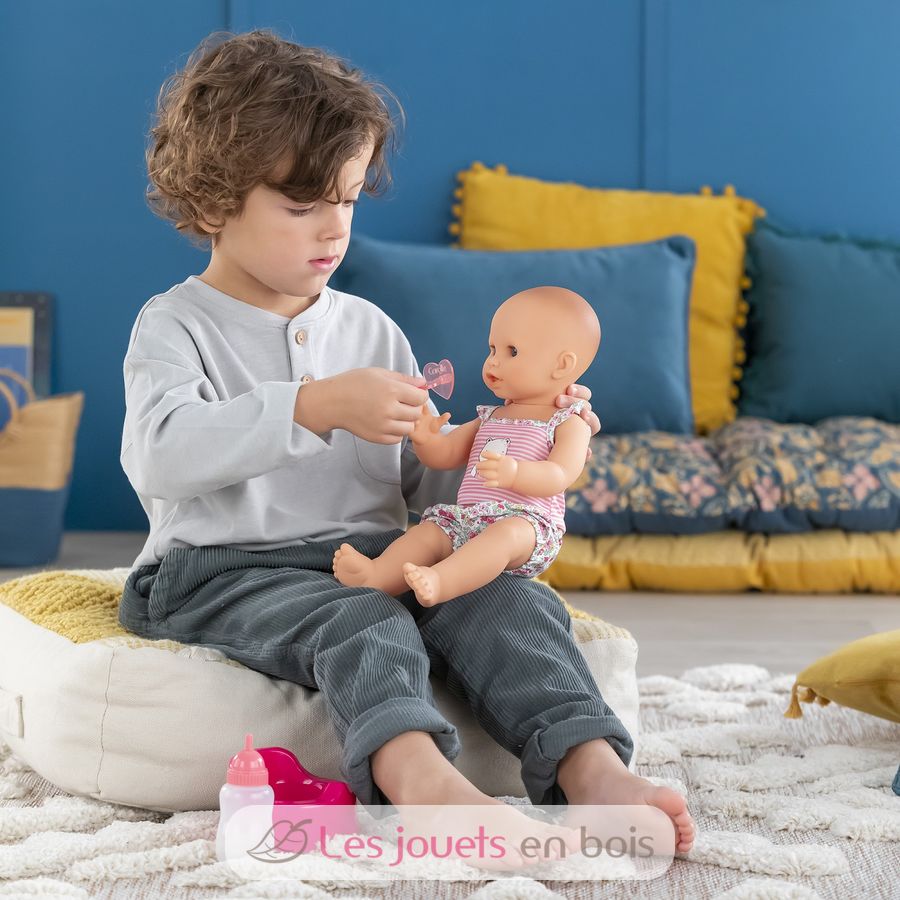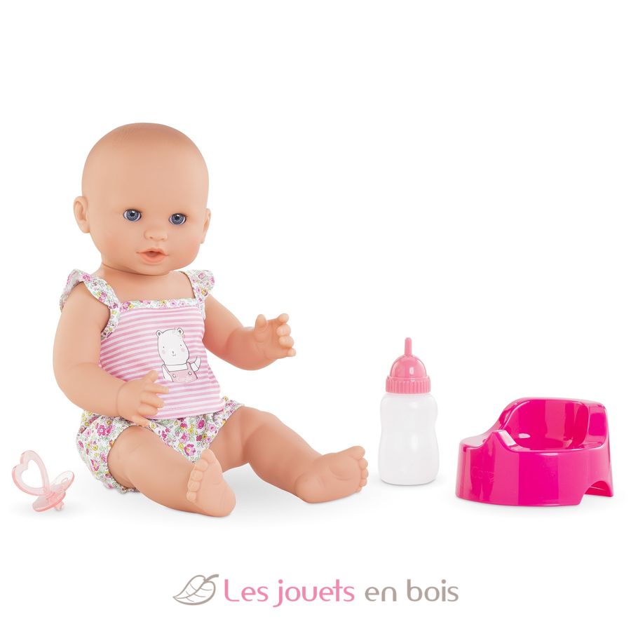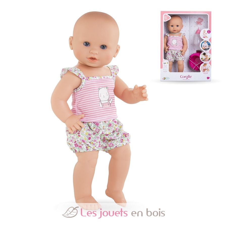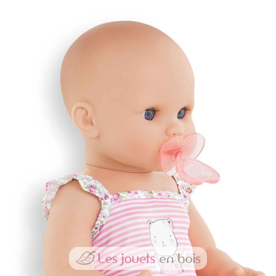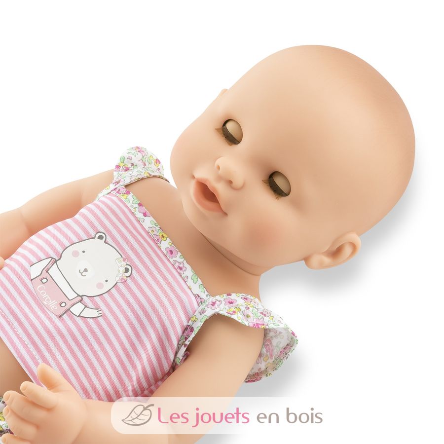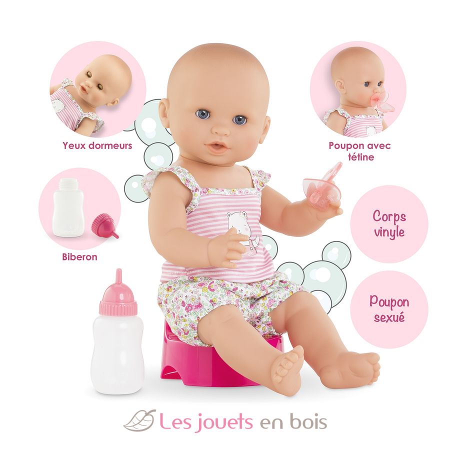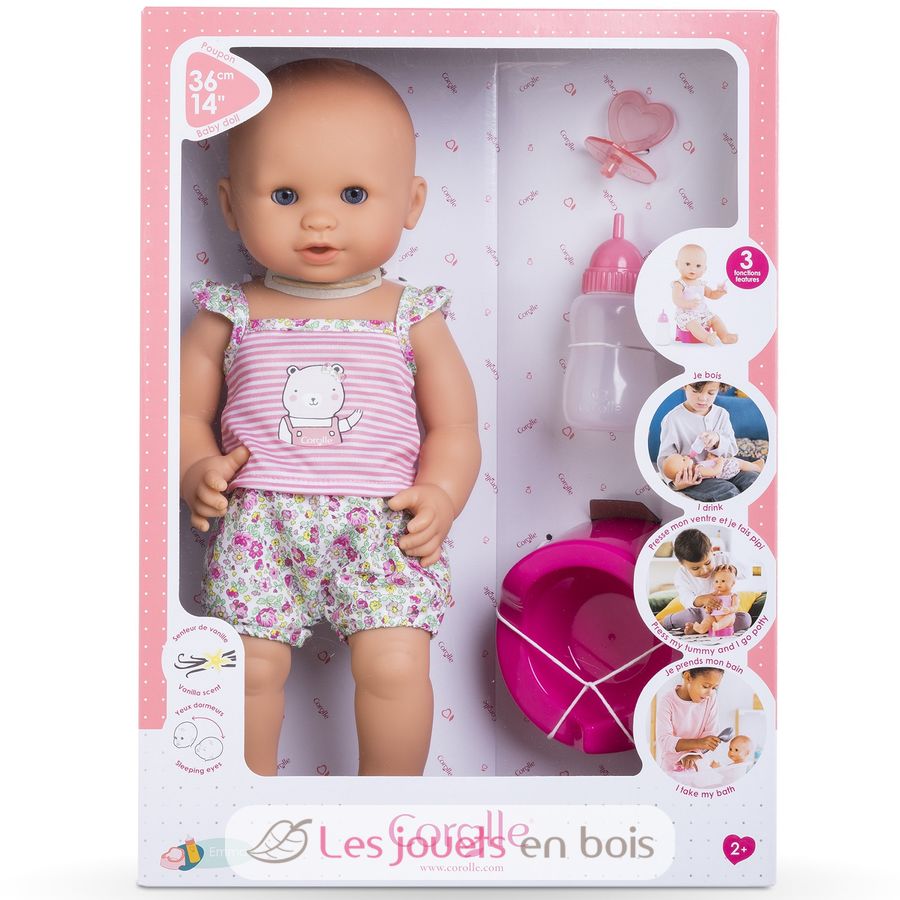 Diese sehr realistische Puppe sitzt alleine. Dank seines komplett aus Vinyl bestehenden Körpers kann es sicher ins Wasser gehen. Es hat einen zarten Vanilleduft, das Markenzeichen der Corolle-Puppen. Mit seinen schläfrigen Augen schließt er die Augen zum Schlafen, wenn Sie ihn auf den Rücken legen. Er kann einen Schnuller nehmen oder am Daumen lutschen.
