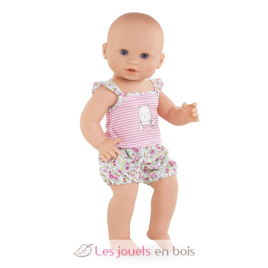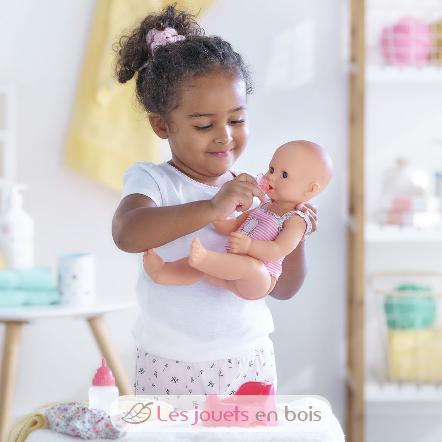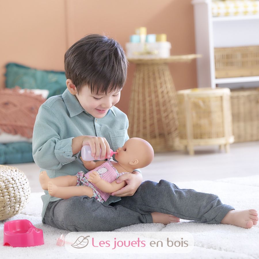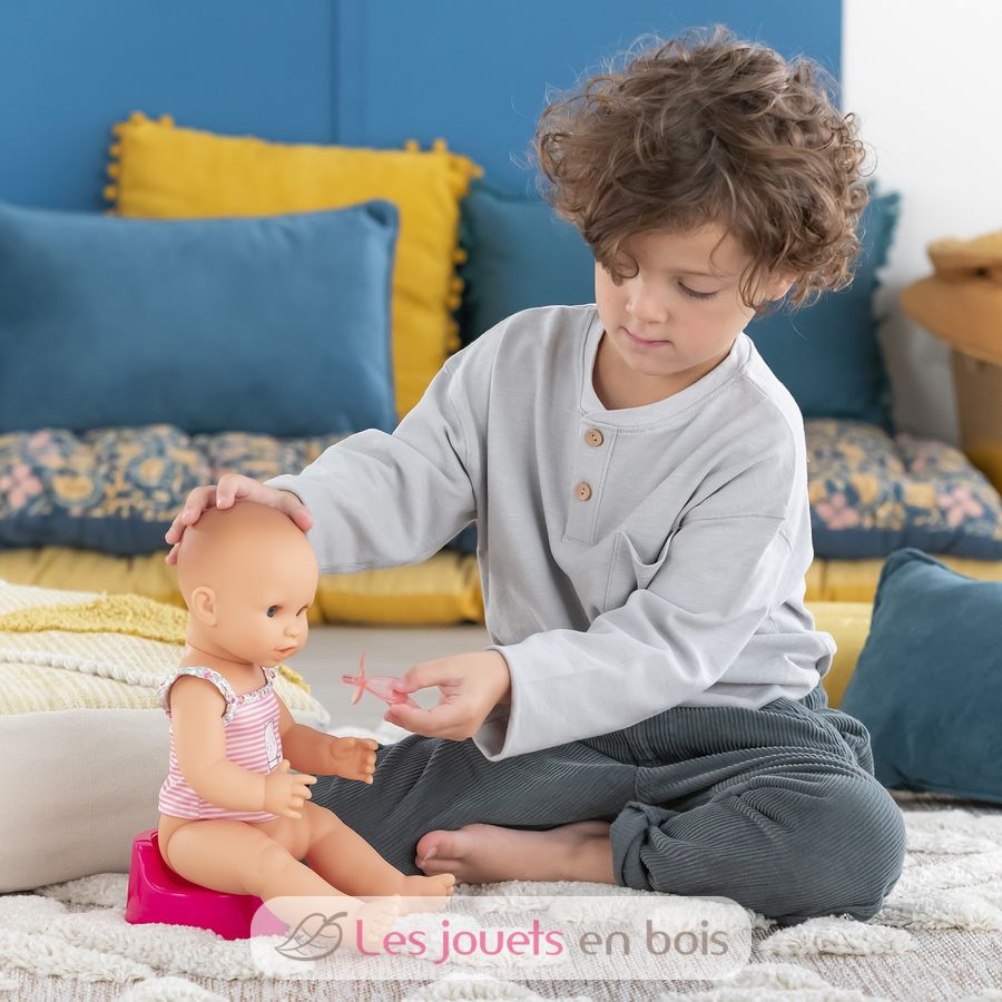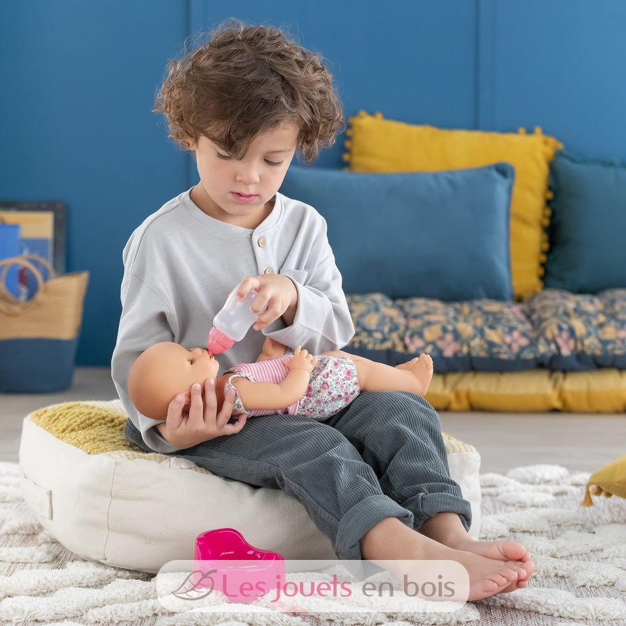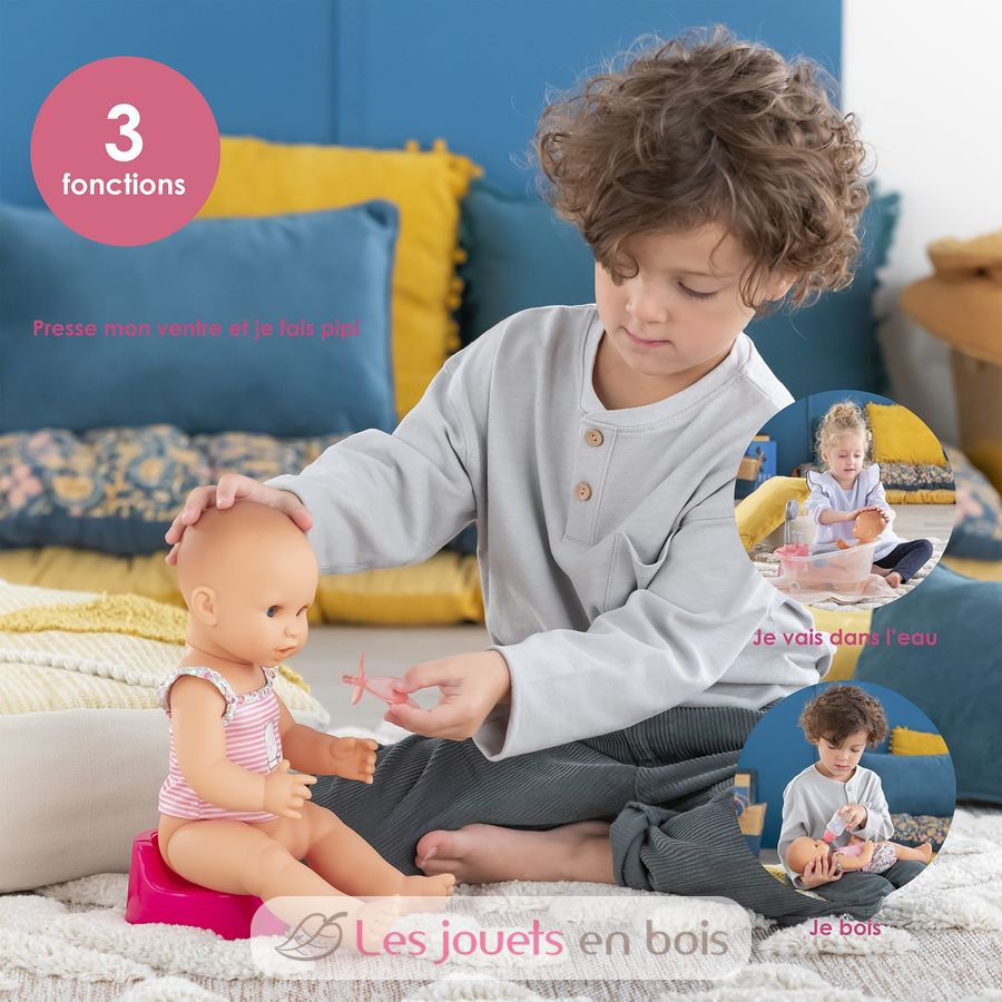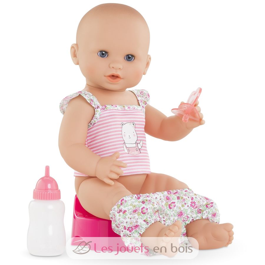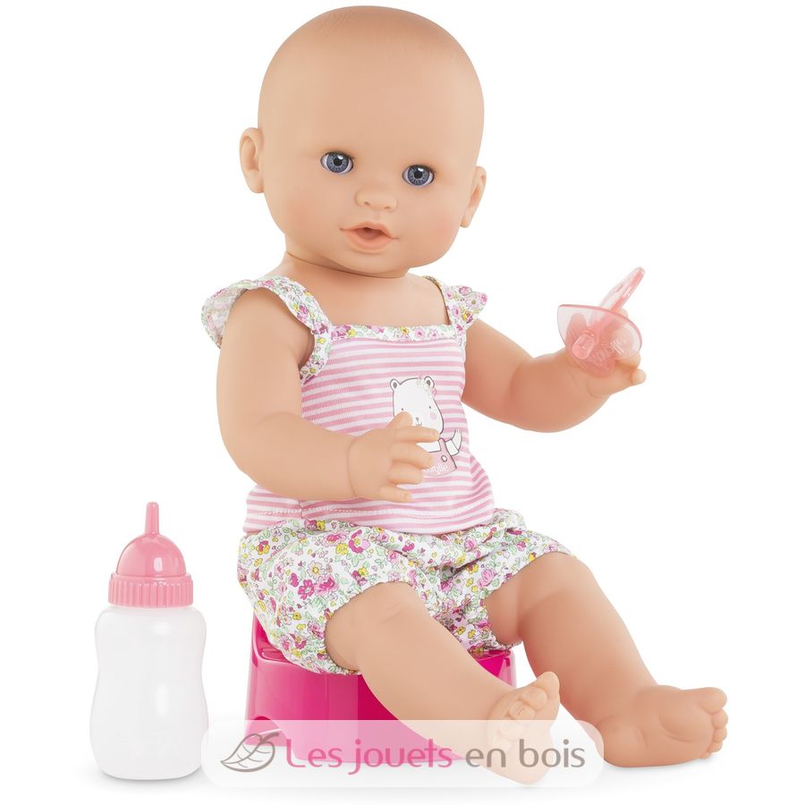 Diese sehr realistische Puppe sitzt alleine. Dank seines komplett aus Vinyl bestehenden Körpers kann es sicher ins Wasser gehen. Es hat einen zarten Vanilleduft, das Markenzeichen der Corolle-Puppen. Mit seinen schläfrigen Augen schließt er die Augen zum Schlafen, wenn Sie ihn auf den Rücken legen. Er kann einen Schnuller nehmen oder am Daumen lutschen.