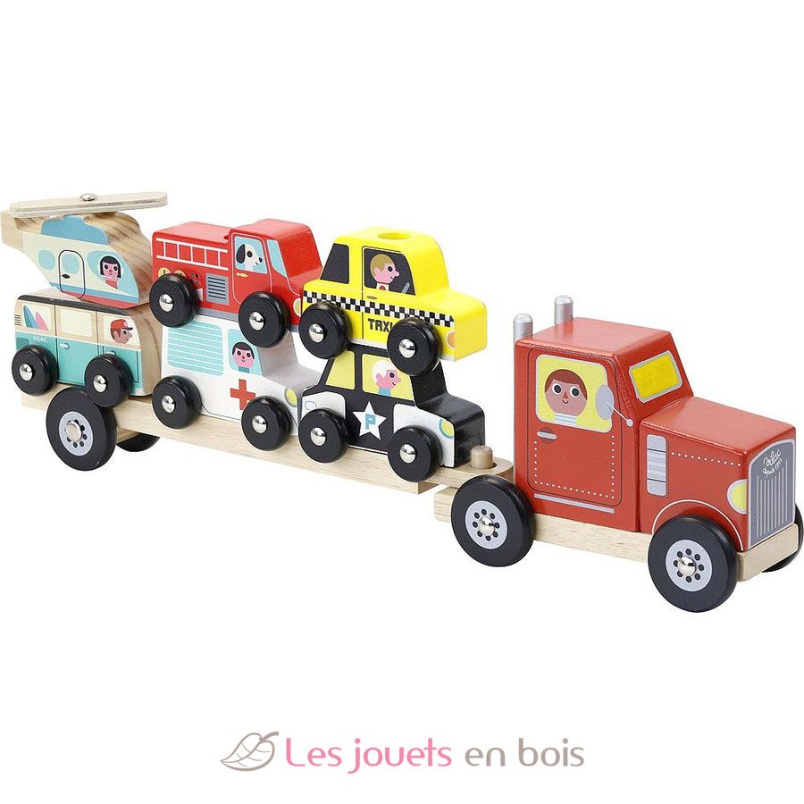Ein Holzspielzeug bestehend aus einem Lastwagen und sechs Fahrzeugen: einem Krankenwagen, einem Feuerwehrauto, einem Polizeiauto, einem Taxi, einem Bus und einem Hubschrauber. Ein Spielzeug für Kinder ab 2 Jahren.