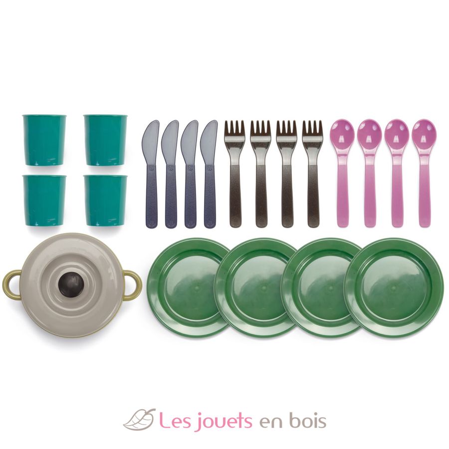 Bei diesem Essservice handelt es sich um ein 22-teiliges Spielset. Das Set besteht aus 4 Tellern, 4 Tassen, 4 Bestecksets und einem Kochtopf mit Deckel.