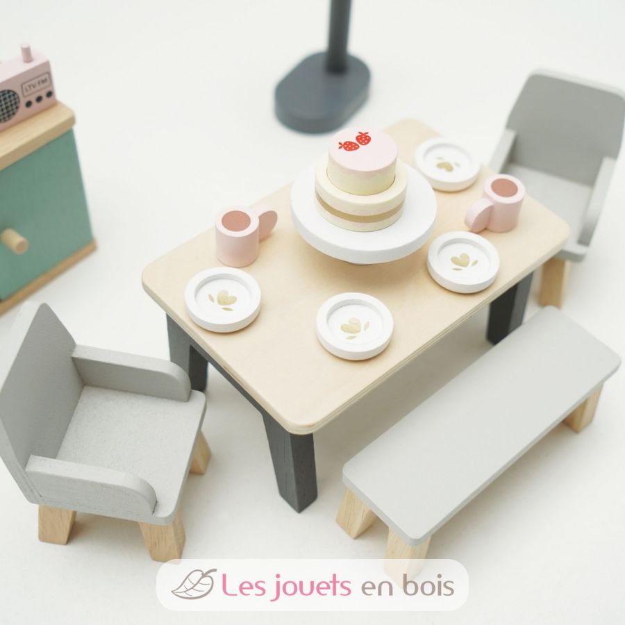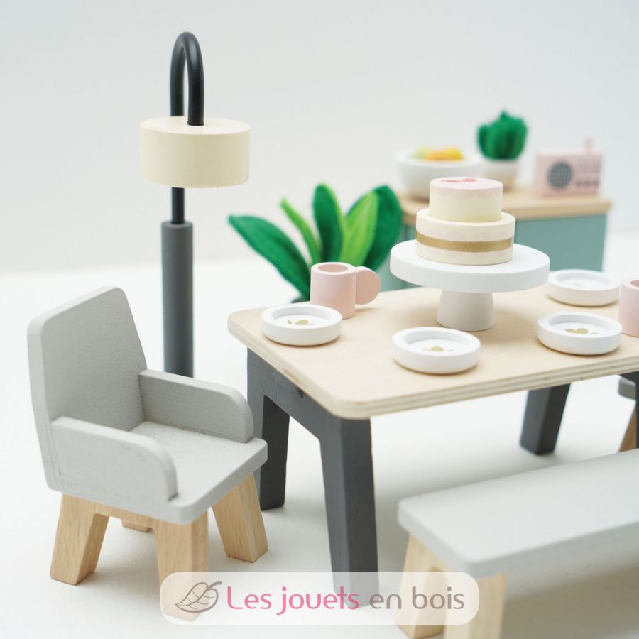 Das perfekte Set für Mini-Dinner-Gäste ist liebevoll aus FSC-zertifiziertem Holz gefertigt und mit unserem gesamten Sortiment an atemberaubenden Puppenhäusern kompatibel.
