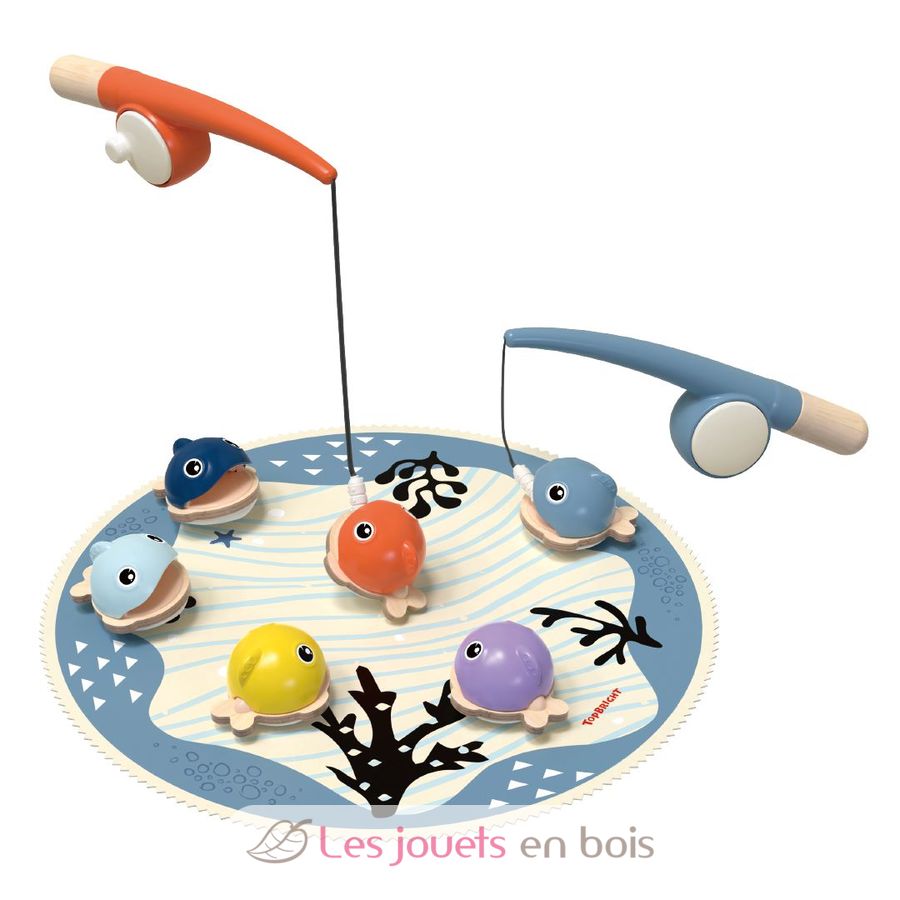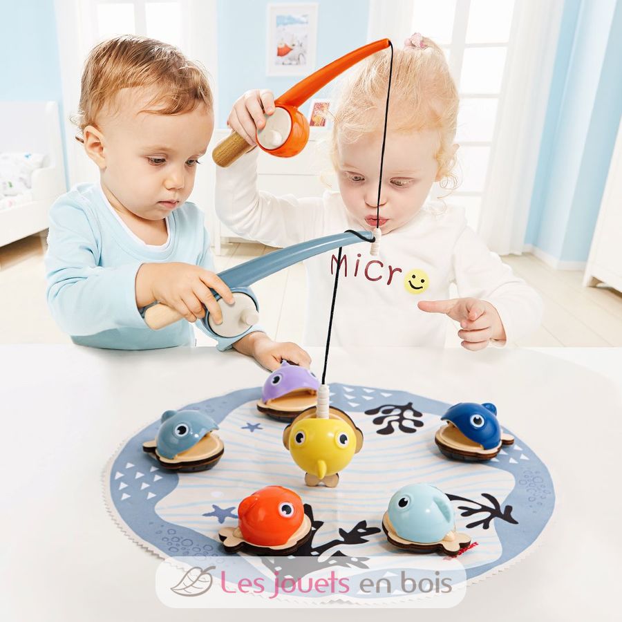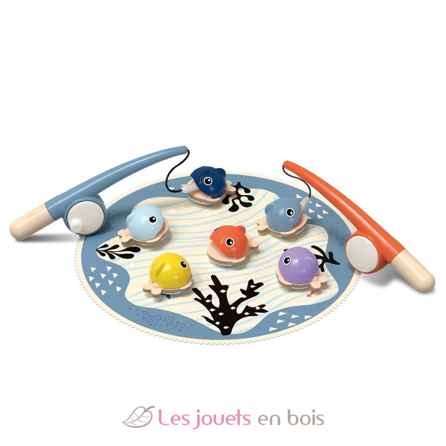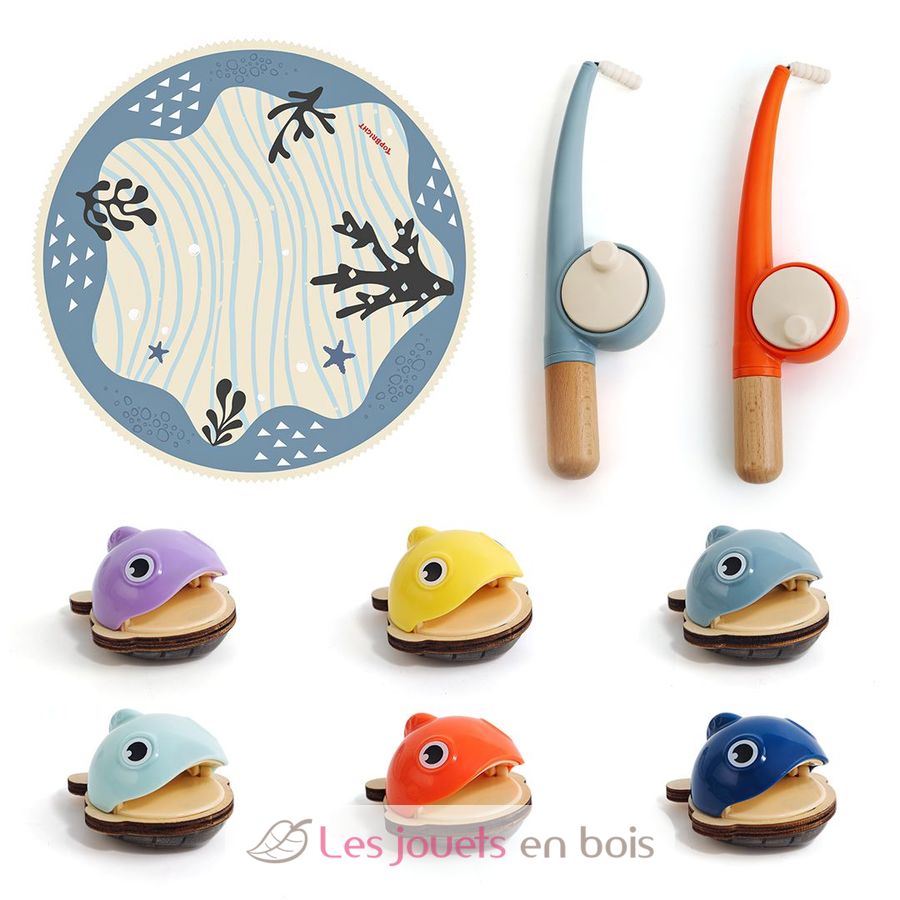 Das Set besteht aus sechs magnetischen, dreidimensionalen Fischen in einem einzigartigen Design, das zum Spielen anregt, zwei funktionalen Angelruten mit realistischen Rollen und einer weichen Stoffmatte als Unterlage.