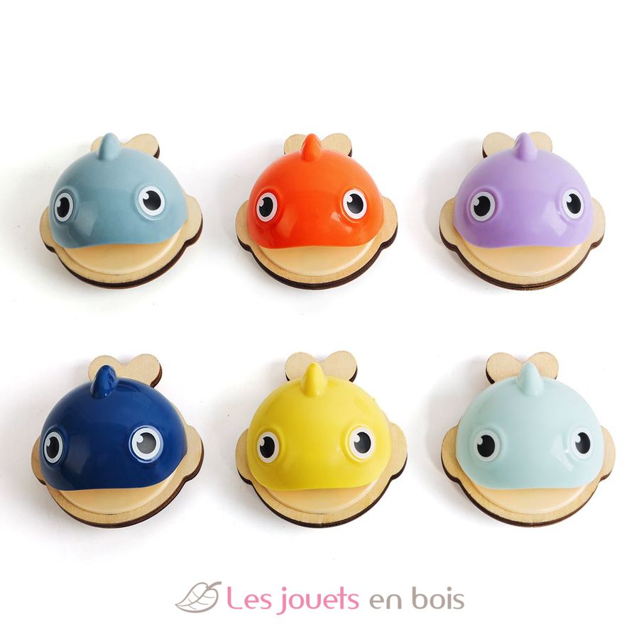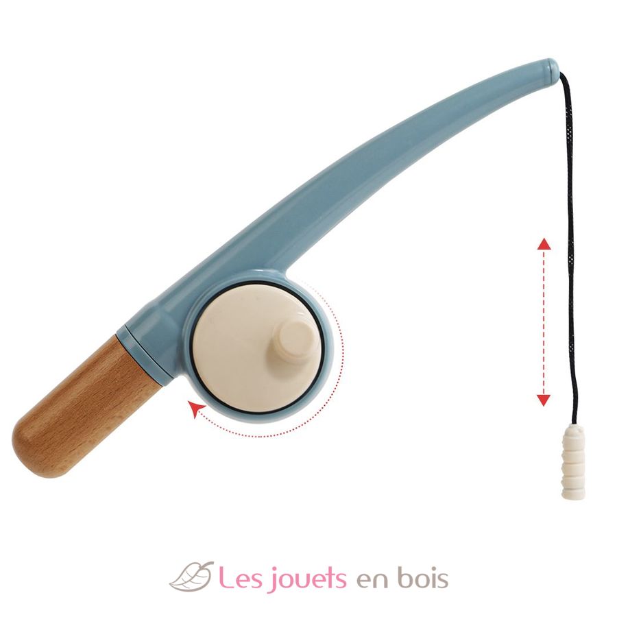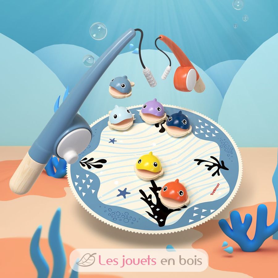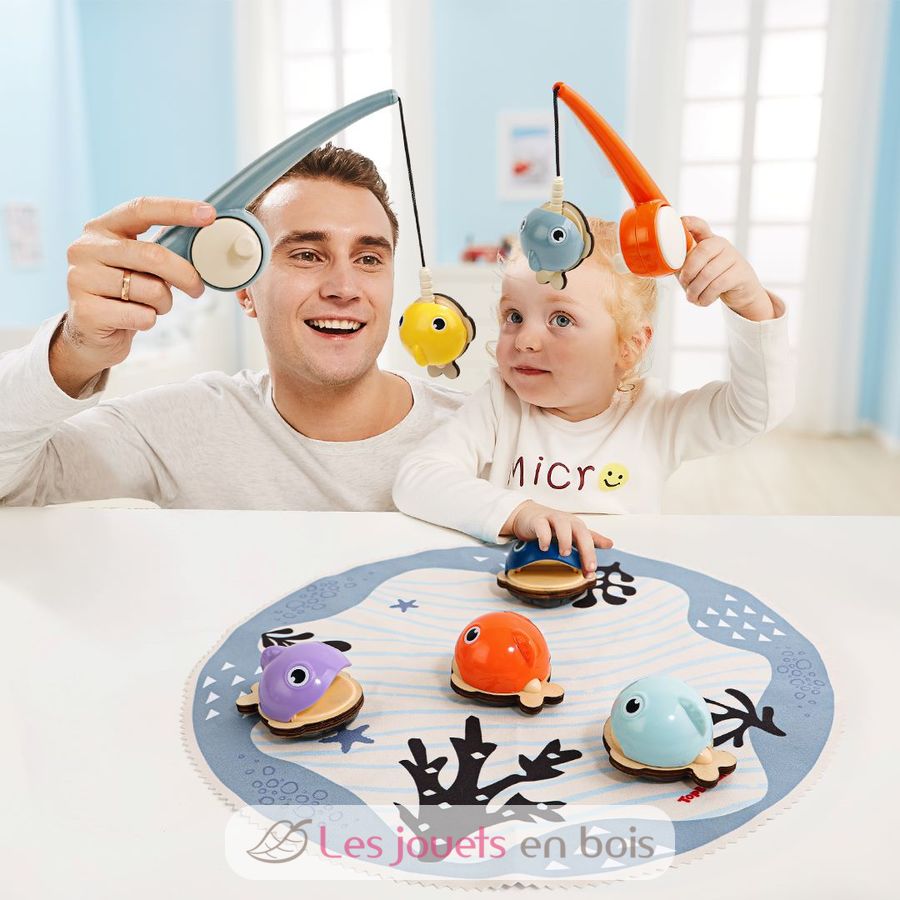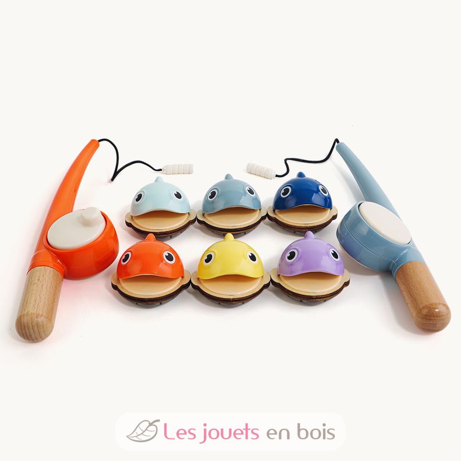 Das Set besteht aus sechs magnetischen, dreidimensionalen Fischen in einem einzigartigen Design, das zum Spielen anregt, zwei funktionalen Angelruten mit realistischen Rollen und einer weichen Stoffmatte als Unterlage.