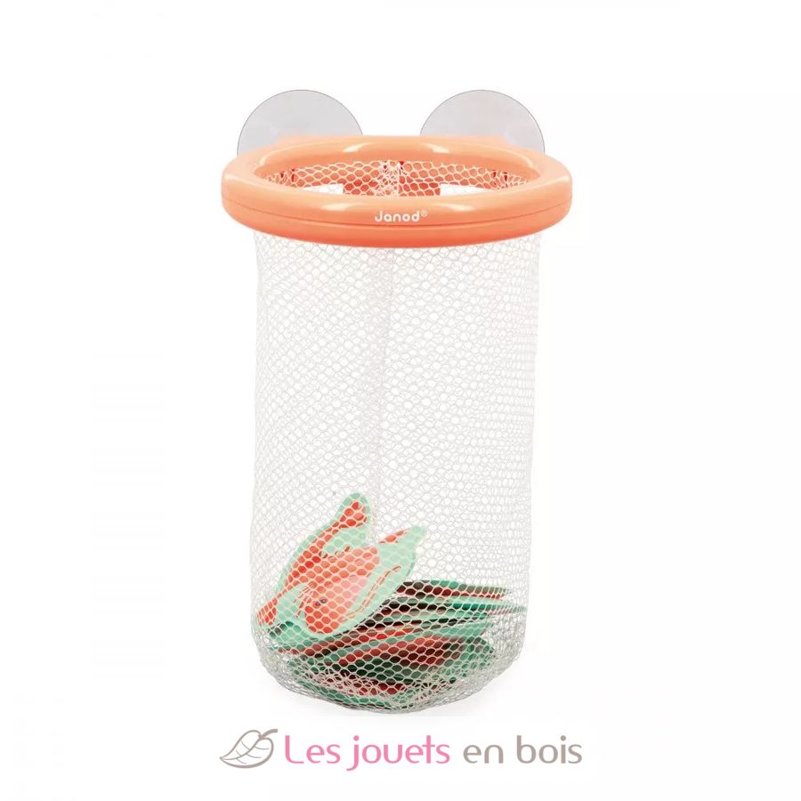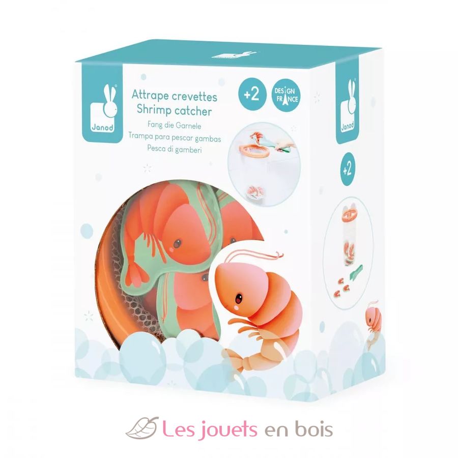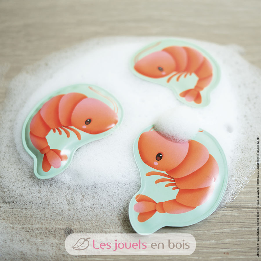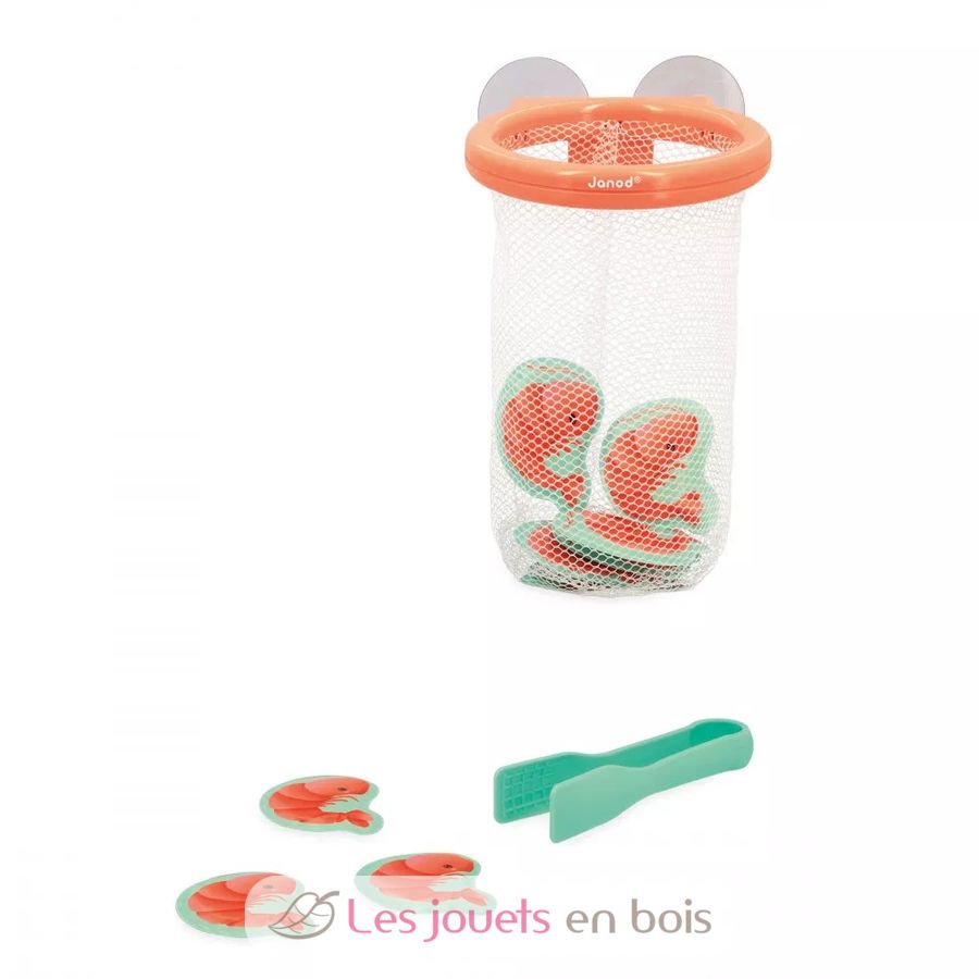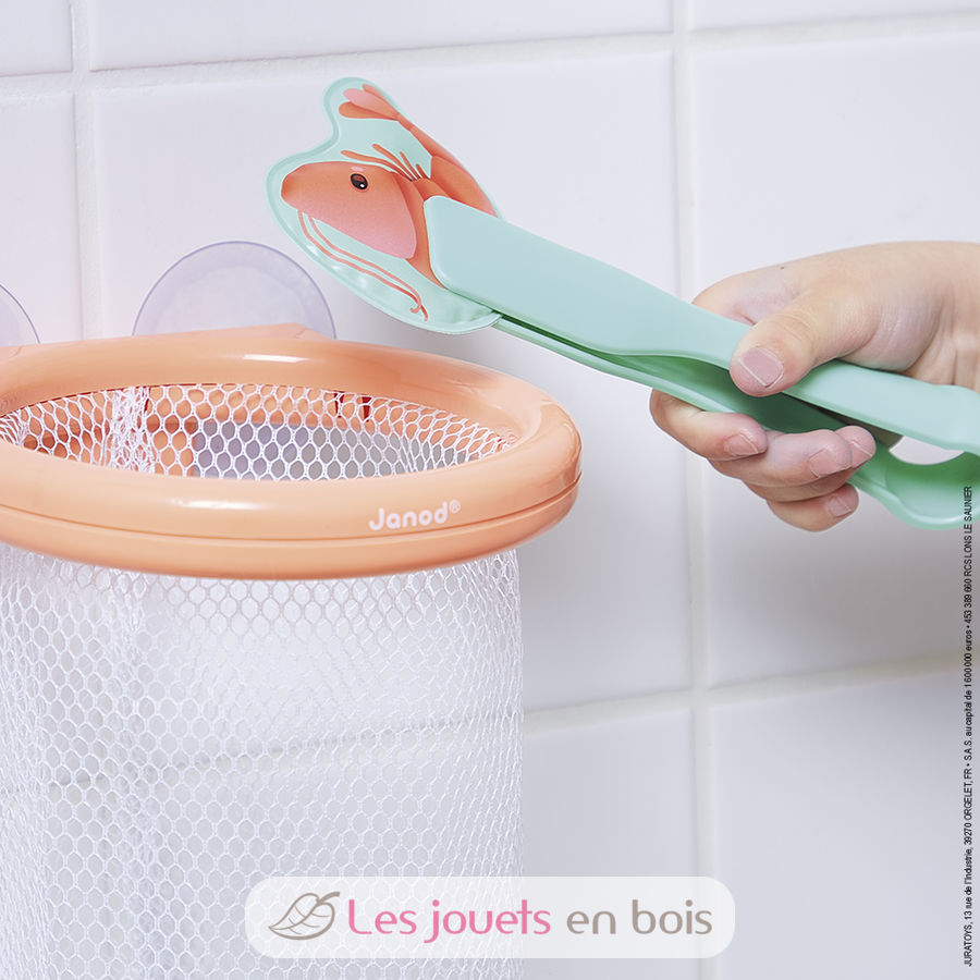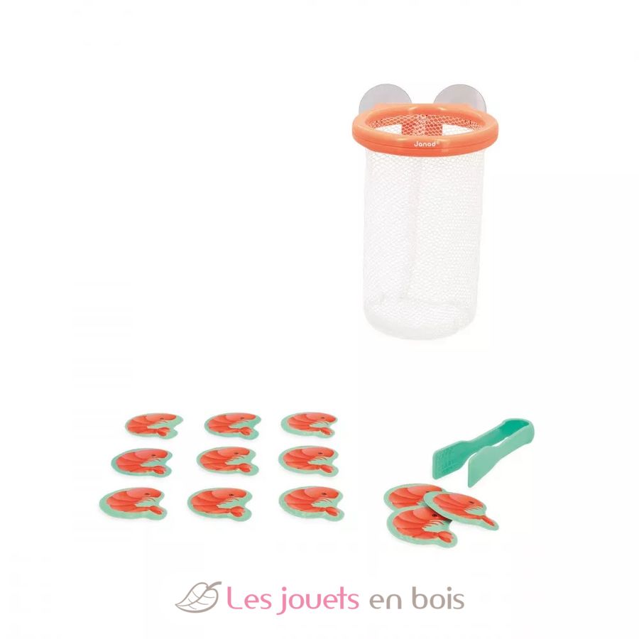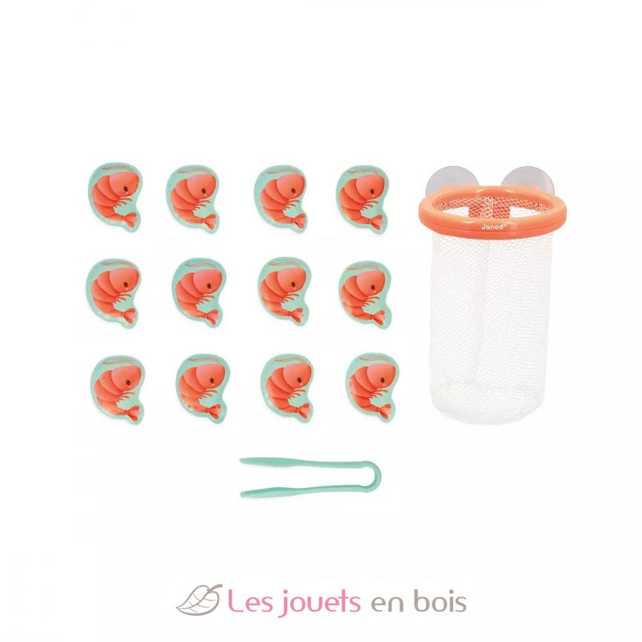 Wer hat Lust, auf Garnelenfang zu gehen? 12 kleine Garnelen sind ins Bad entwischt. Jetzt ist Beweglichkeit gefordert, um sie schnell einzufangen! Mit der Garnelenzange kann Ihr Kind jede Garnele fangen, die auf der Wasseroberfläche schwimmt, und sie in einen hübschen Korb legen, der dank seiner Saugnäpfe an den Fliesen befestigt werden kann. Die Regeln können Sie sich ausdenken: am schnellsten alle Garnelen sammeln oder als Team, indem Sie sich bei diesem außergewöhnlichen Angelspiel abwechseln!