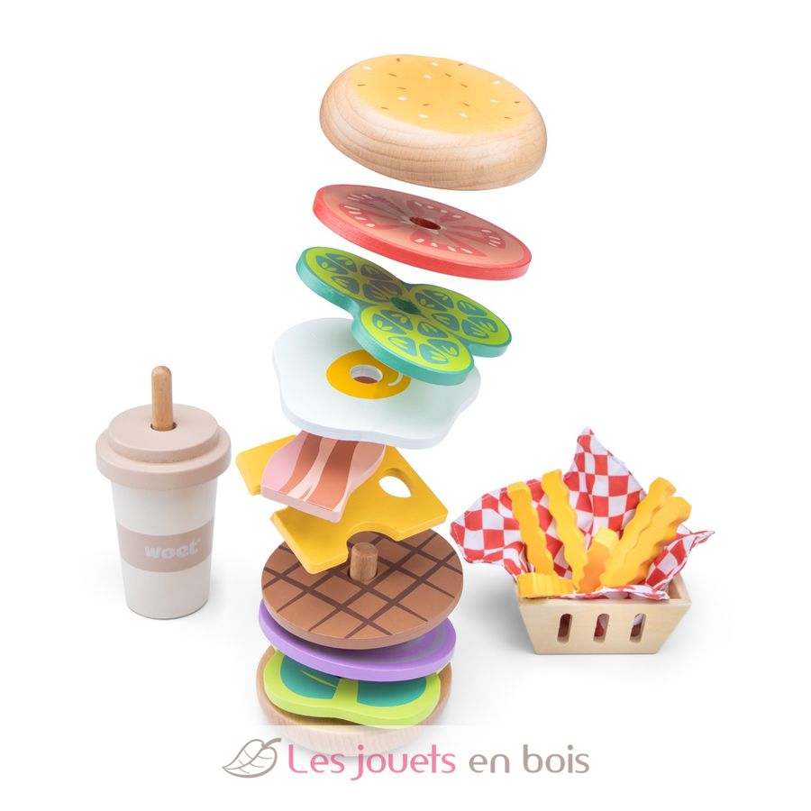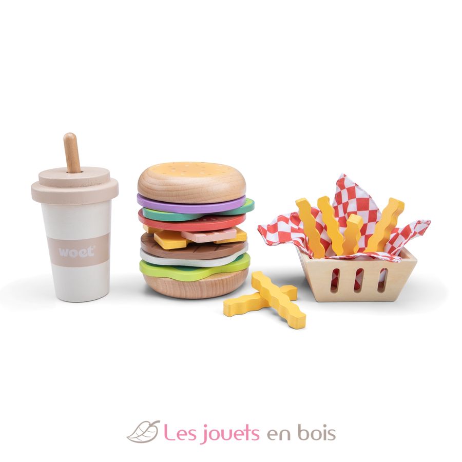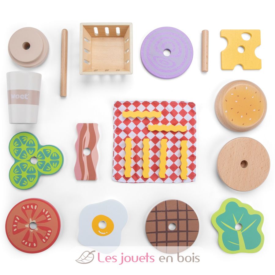 Das Set enthält einen Burger zum Selbstbelegen mit stapelbaren Zutaten, eine Portion Pommes frites und einen Milchshake-Becher aus Holz mit Strohhalm. Kinder können die Toppings nach Belieben kombinieren und so ihre Lieblingsburger kreieren.