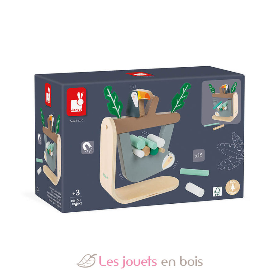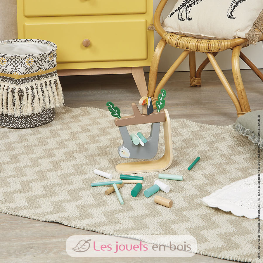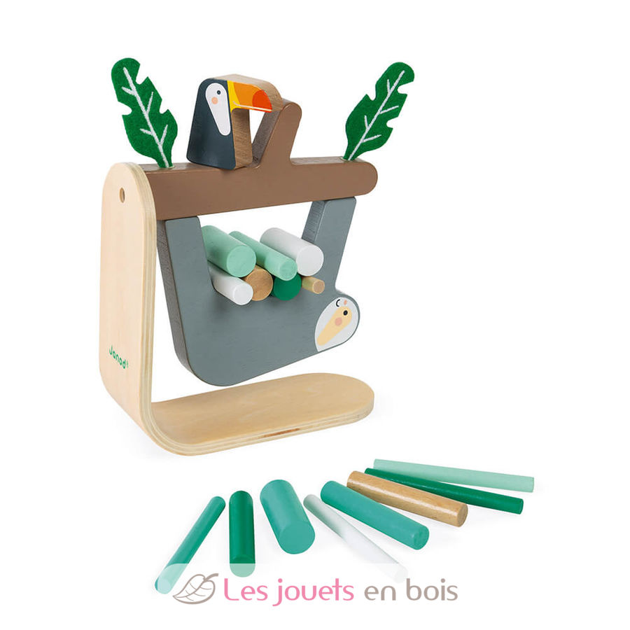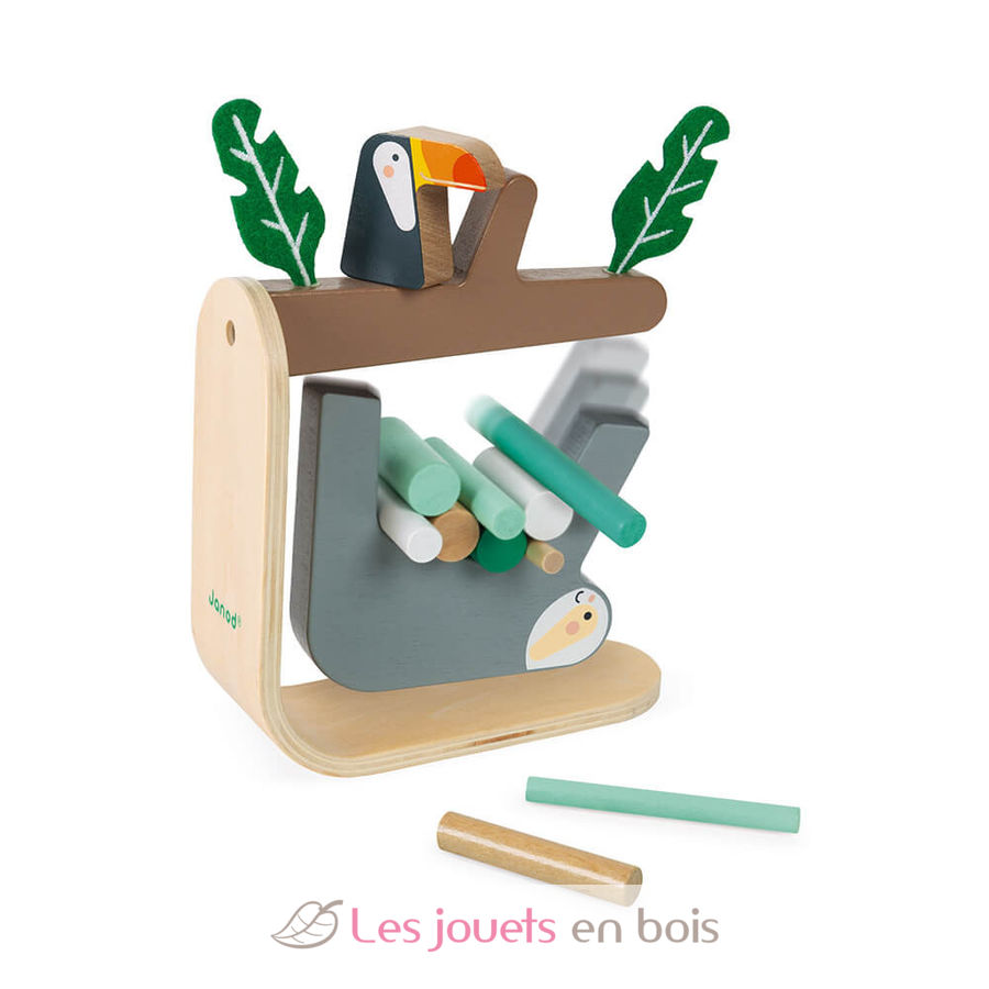Es macht friedlich sein Nickerchen, unser Faultier ... Aber es hat die Rechnung ohne die Kinder gemacht, die genau jetzt Lust auf ein bisschen Spaß haben! Bei diesem hübschen Holzspielzeug für Kinder ab 3 Jahren ist Geschicklichkeit gefordert! Dieses Balancespiel besteht aus einem magnetischen Faultier, das an seinem Ast hängt, und 15 Stäben. Es kann allein oder mit mehreren Spielern gespielt werden. Das Ziel? So viele Stäbe wie möglich auf den Bauch des Faultiers legen, bevor es den Ast loslässt! Bei mehreren Spielern hat derjenige verloren, der den Stab legt, bei dem Faultier den Ast loslässt! Die Blätter dieses schönen Spiels sind aus weichem Filz. Dieses Spiel ist perfekt, um Geduld und Geschicklichkeit zu entwickeln.
