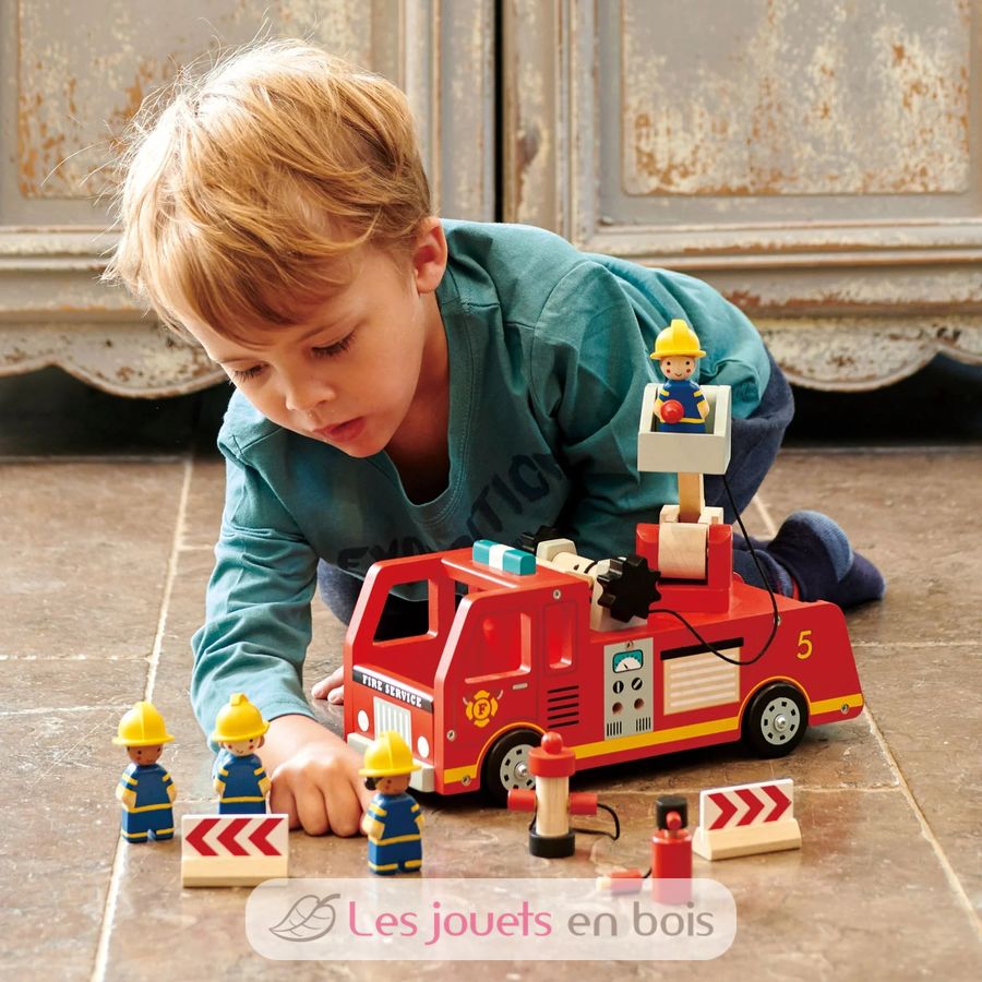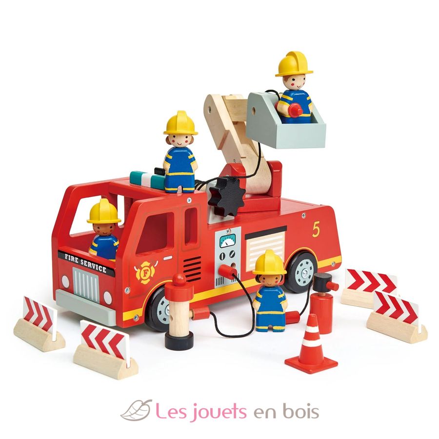Dieses Feuerwehrauto verfügt über einen abrollbaren Schlauch und einen ausfahrbaren Arm aus Naturholz, mit dem die vier Feuerwehrmänner in schwindelerregende Höhen fahren können, um Brände zu bekämpfen oder ein Kätzchen zu retten!
