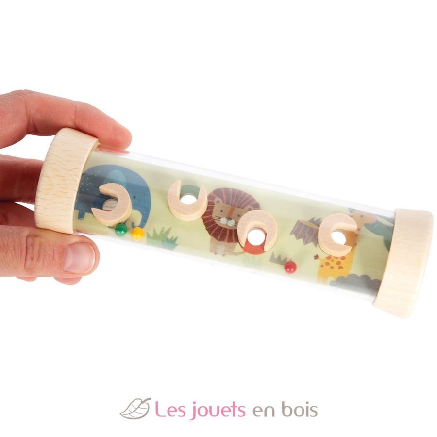Vornehmlich fordert das Kugellabyrinth in der robusten, transparenten Röhre die motorischen Fähigkeiten kleiner Tüftler heraus, wenn die 4 im Inneren umherkullernden Holzkügelchen geschickt durch die Labyrinthaufgaben manövriert werden. Je nach Seite warten zwei verschiedene Holzlabyrinthe darauf, gelöst zu werden. Das liebevoll kindgerechte Design mit Wildtieren wie Zebra, Giraffe, Löwe, Krokodil und Co. macht das Spiel zudem zu einem visuellen Highlight und regt die Fantasie an. Handschmeichlerisches Holz und eine für Kinderhände passende Größe machen das Geduldsspiel zu einem schönen Zeitvertreib für zwischendurch. Ideal für zuhause, unterwegs oder als Mitbringsel.