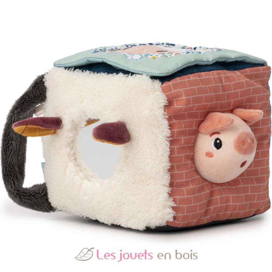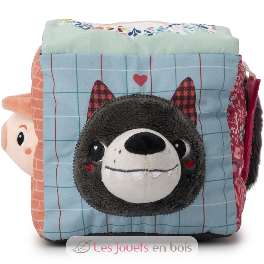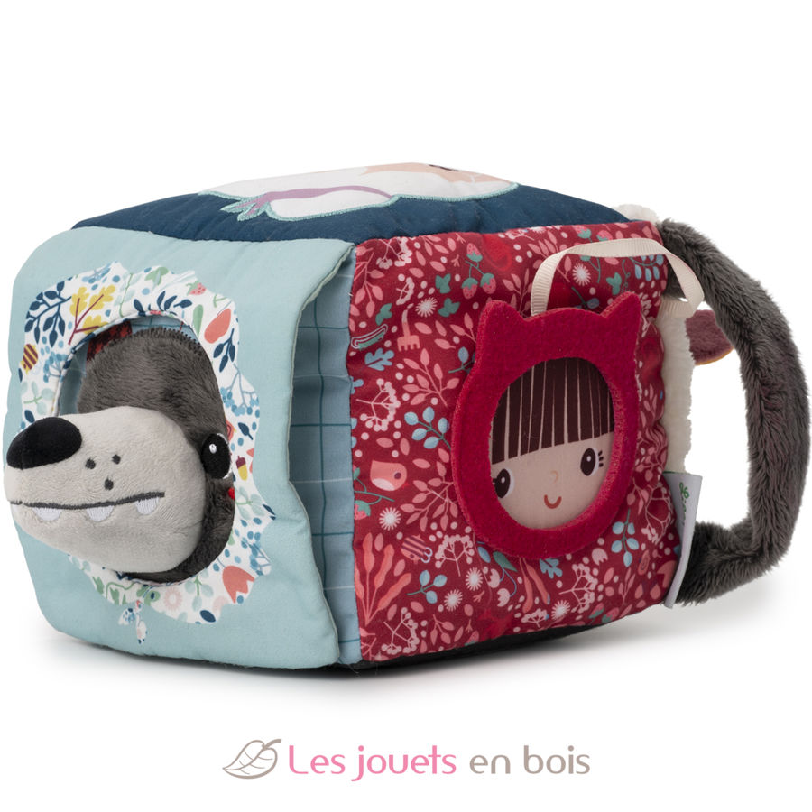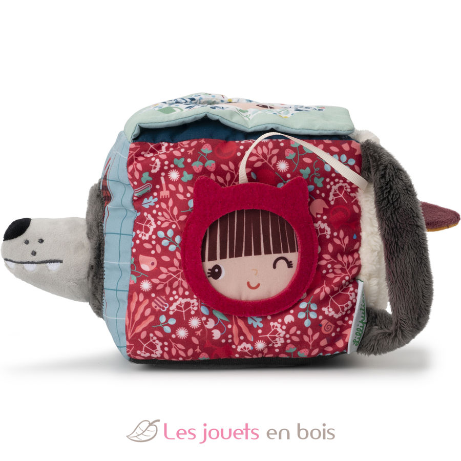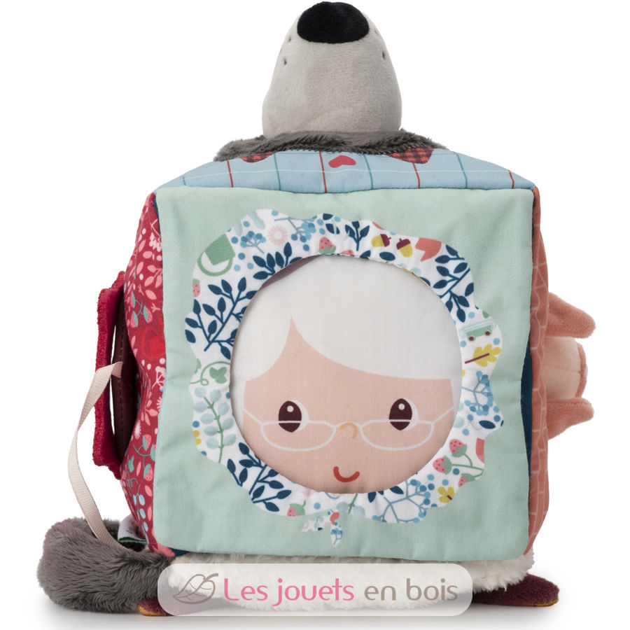 Ein bunter Würfel mit verschiedenen Geräuschen, Materialien und einer Überraschung auf jeder Seite. Klappen und Formen verbergen Großmutter, den Wolf, Rotkäppchen und ein kleines Schwein. Und was siehst du im Spiegel?
