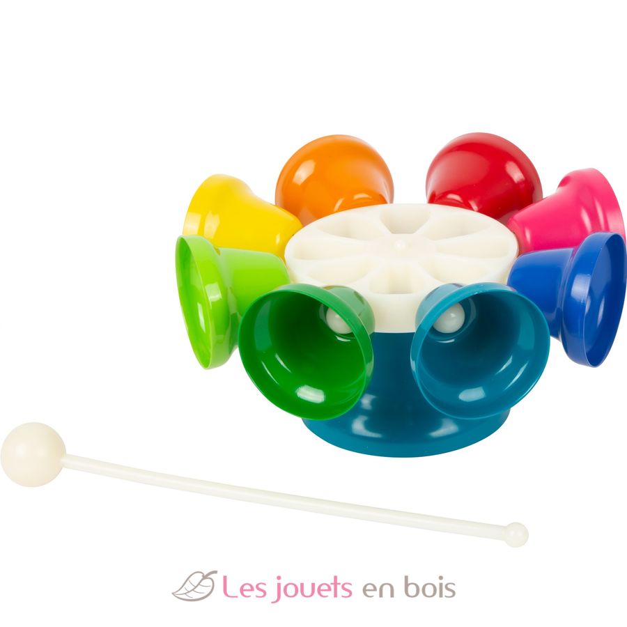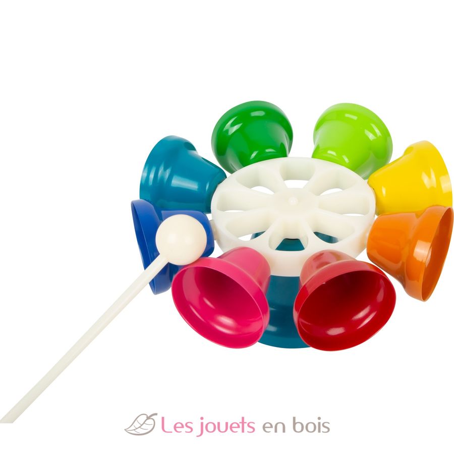 Dieses Glockenkarussel mit acht farblich codierten Glöckchen sorgt für Dynamik in der musikalischen Früherziehung. Nach Belieben kann das Glockenrad mit seinen auf die Noten C, D, E, F, G, A, H, C gestimmten Glöckchen zum Musizieren auf den Ständer gesetzt oder in die Hand genommen werden. Mit dem Schlägel werden einzelne Töne angespielt - wer die ganze Tonleiter erklingen lassen möchte, hält den Schlägel an die Glocken, während sich der Glockenring dreht. Inkl. Notenblatt mit acht verschiedenen Liedern.