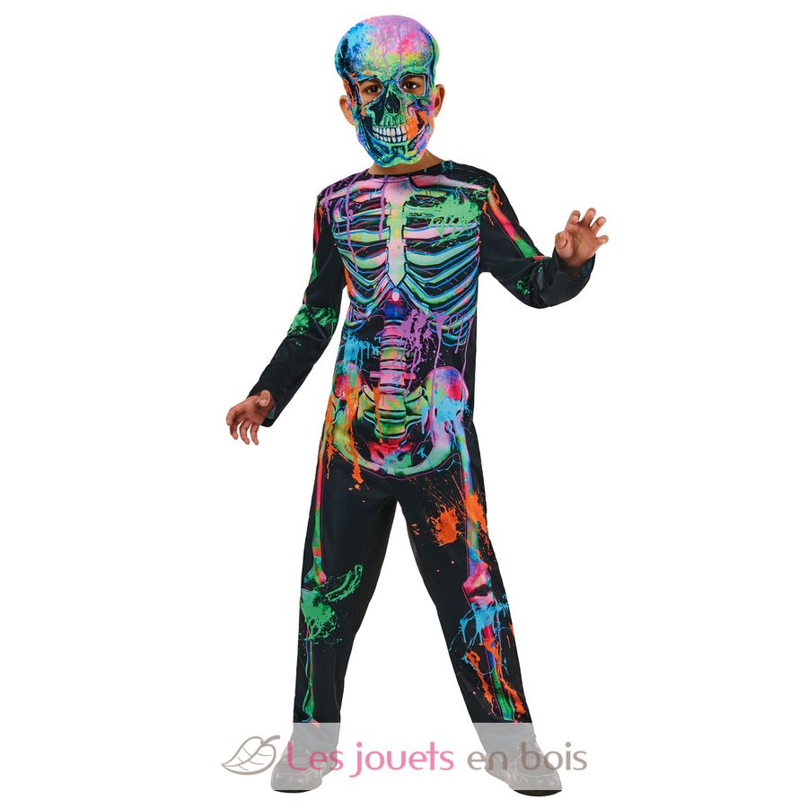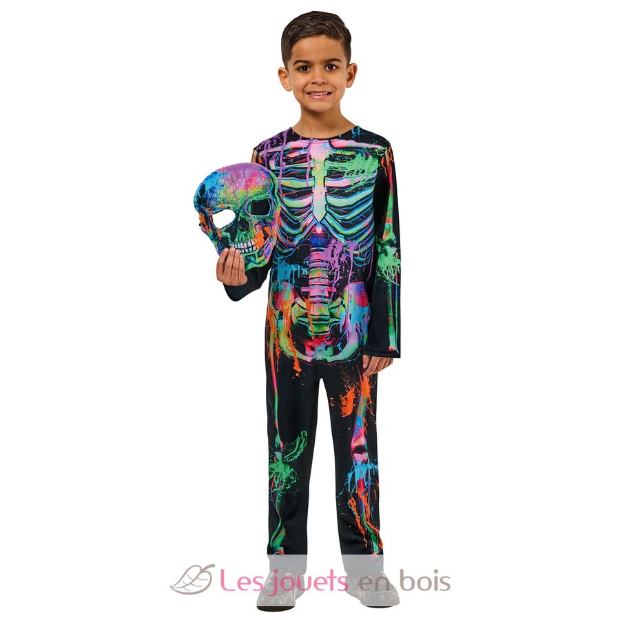 Dieses Kinderkostüm besteht aus einem schwarzen Overall mit aufgedruckten Skelettmustern und einer Skelettmaske.