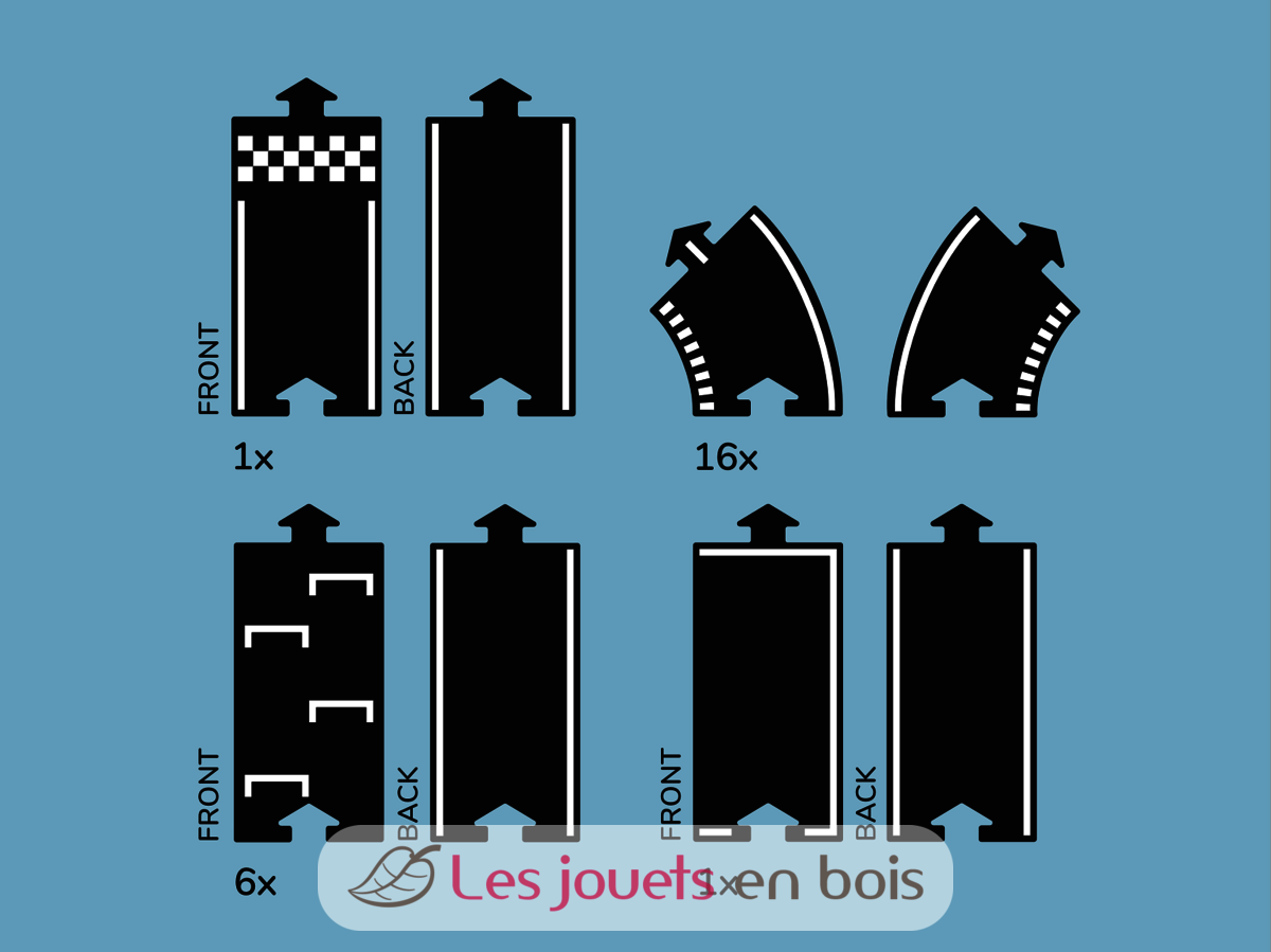 Das 24-teilige Set eignet sich perfekt als Einstieg in die Welt von waytoplay. Es lässt sich jederzeit ganz einfach durch den Zukauf zusätzlicher Sets erweitern. Beinhaltet 12 Kurven und 8 Geraden, beidseitig bedruckt. Sehen Sie Ihren Kindern dabei zu, wie sie für ihre Lieblingsspielzeuge und Autos ihre ganz eigenen Rundkurse und Straßenverläufe bauen !