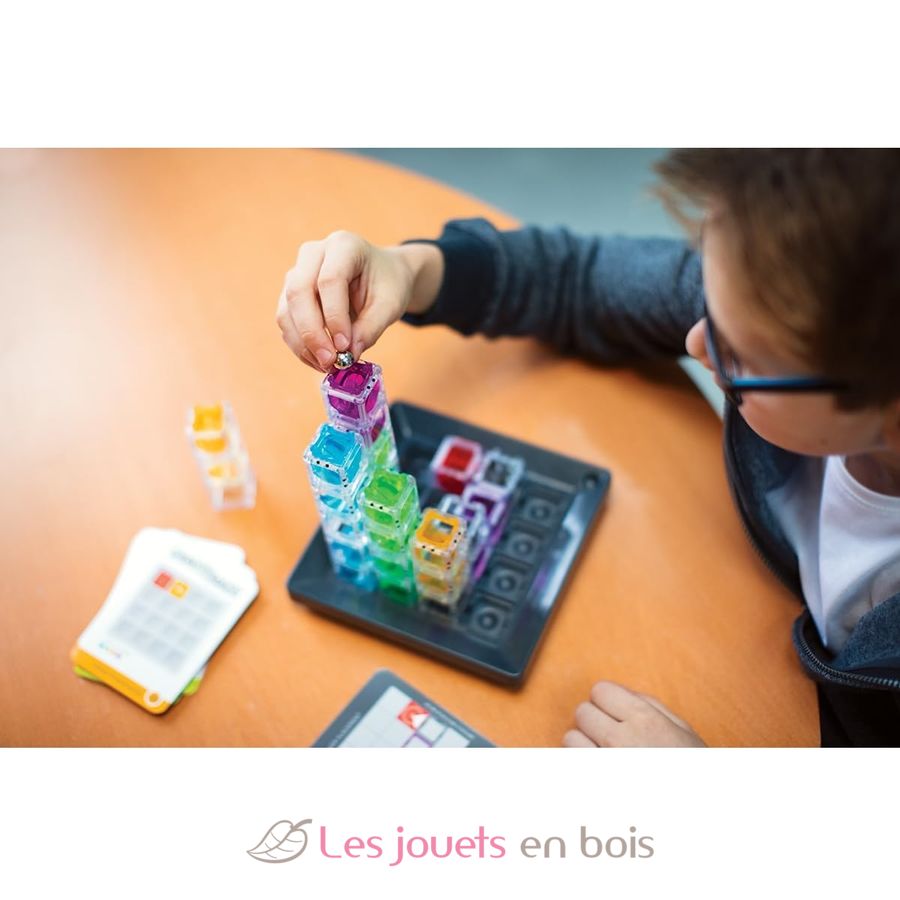 3. Positioniere die Türme so, dass die Murmel von der Startposition fällt, jeden Turm durchläuft und schließlich im Zielturm landet.